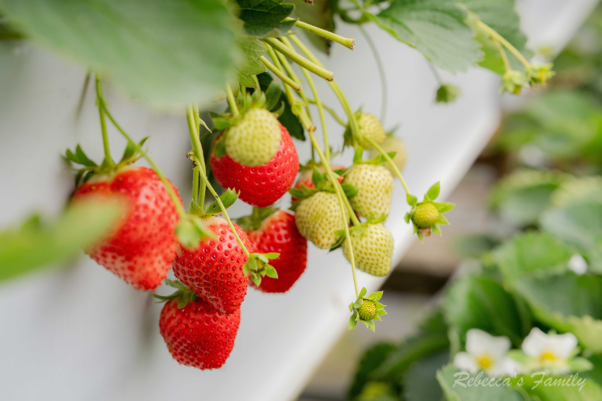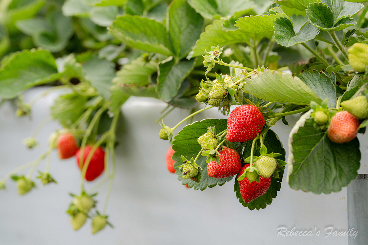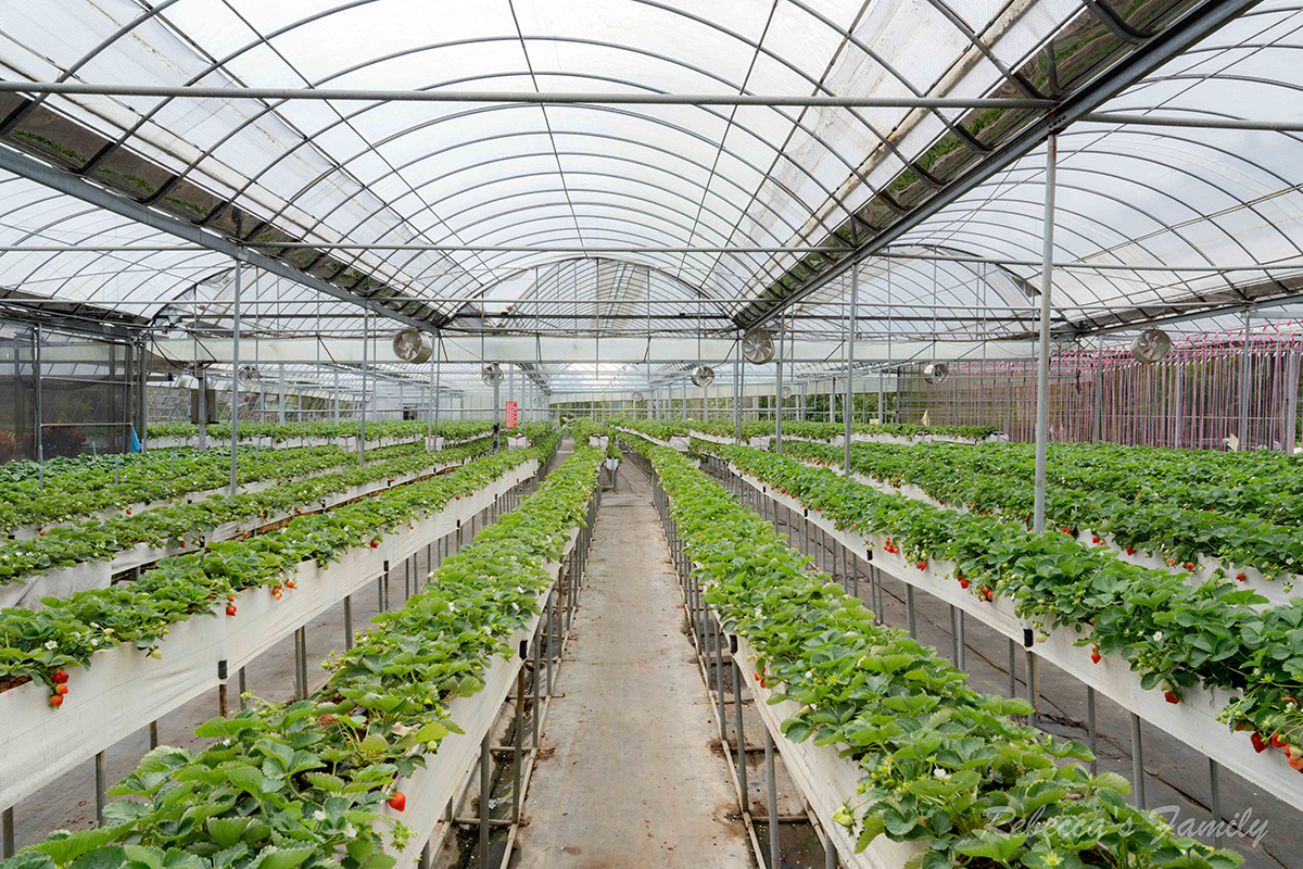 我們這次在高架草莓區活動,真的很推薦給親子家庭!不用彎腰採果,對大人小孩都很友善,也不怕鞋子沾滿泥巴。上方還架設了黑色網棚,不但能調整日照,也能防止鳥類啄食草莓。