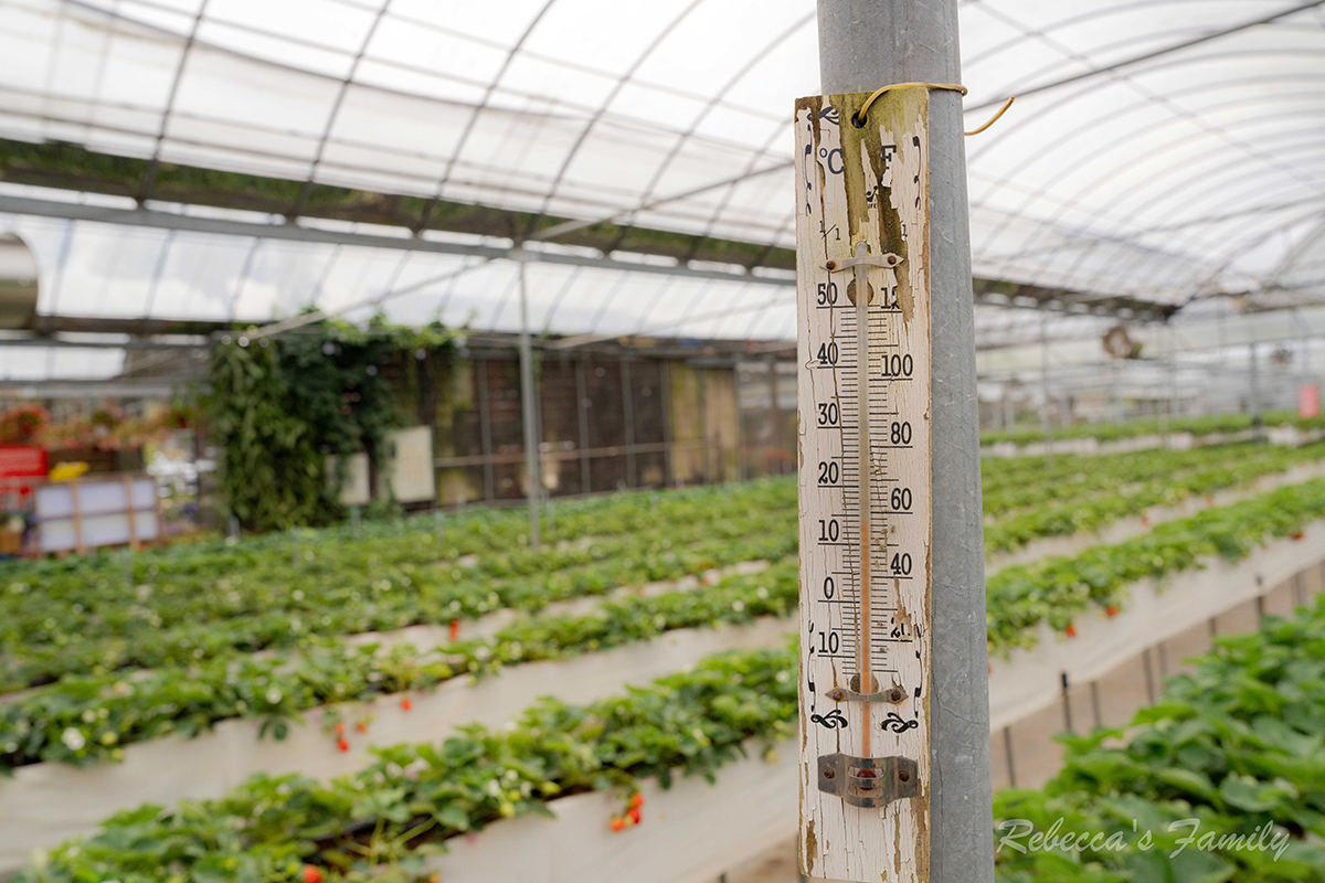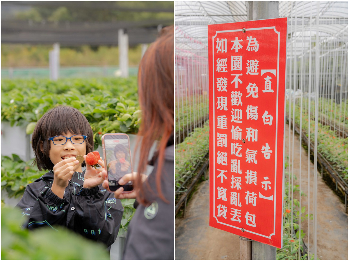 進入園區後,遊客可以自行拿取提籃與剪刀,就能開始採草莓囉!園方也特別提醒,嚴禁偷吃草莓或隨意丟棄,這點我們也趁機好好教育孩子要尊重農作物。如果不小心採到有缺損的草莓,結帳時老闆也會貼心地幫忙更換新的,讓人感覺相當安心。