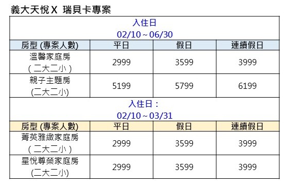 - 03/31前入住,每日限量5間升等「星悅尊榮家庭房」(原房差$1100元)線上選升等