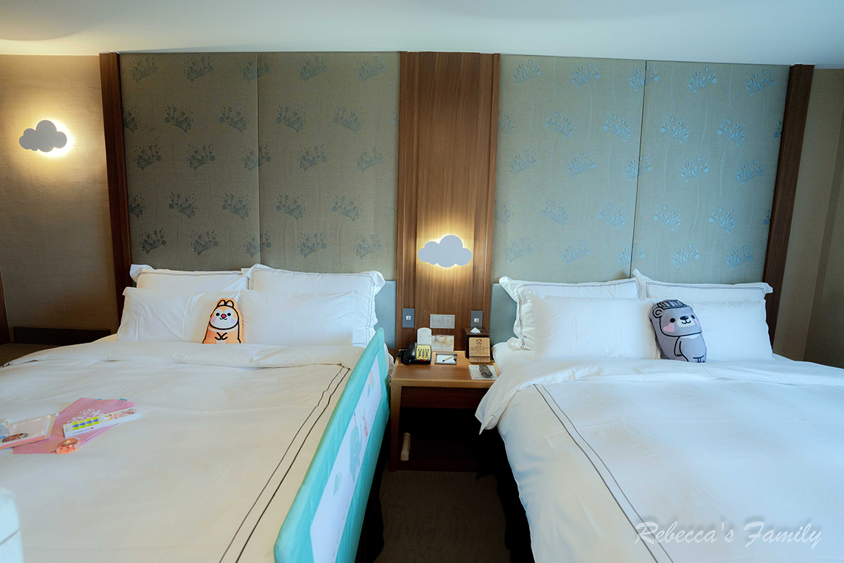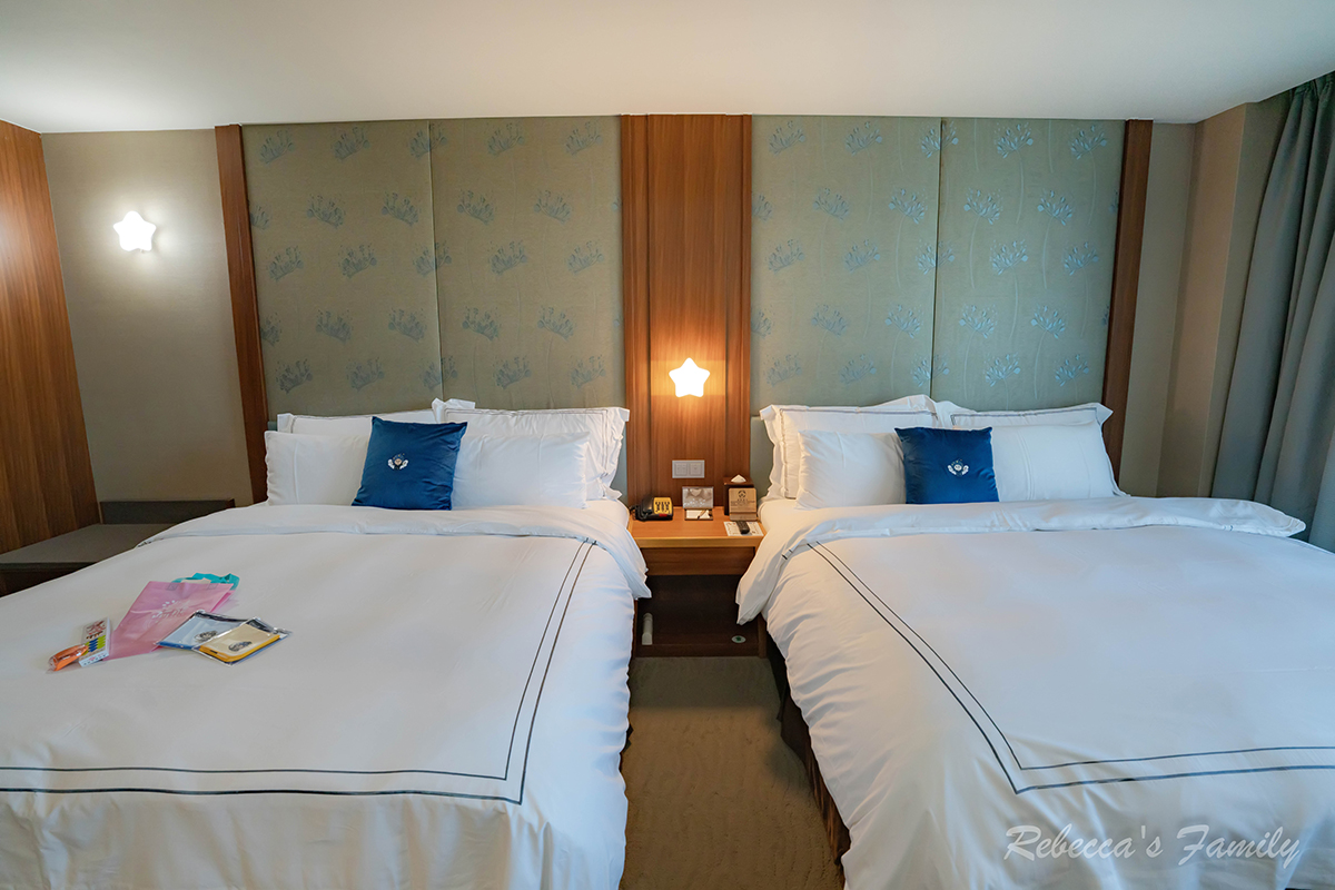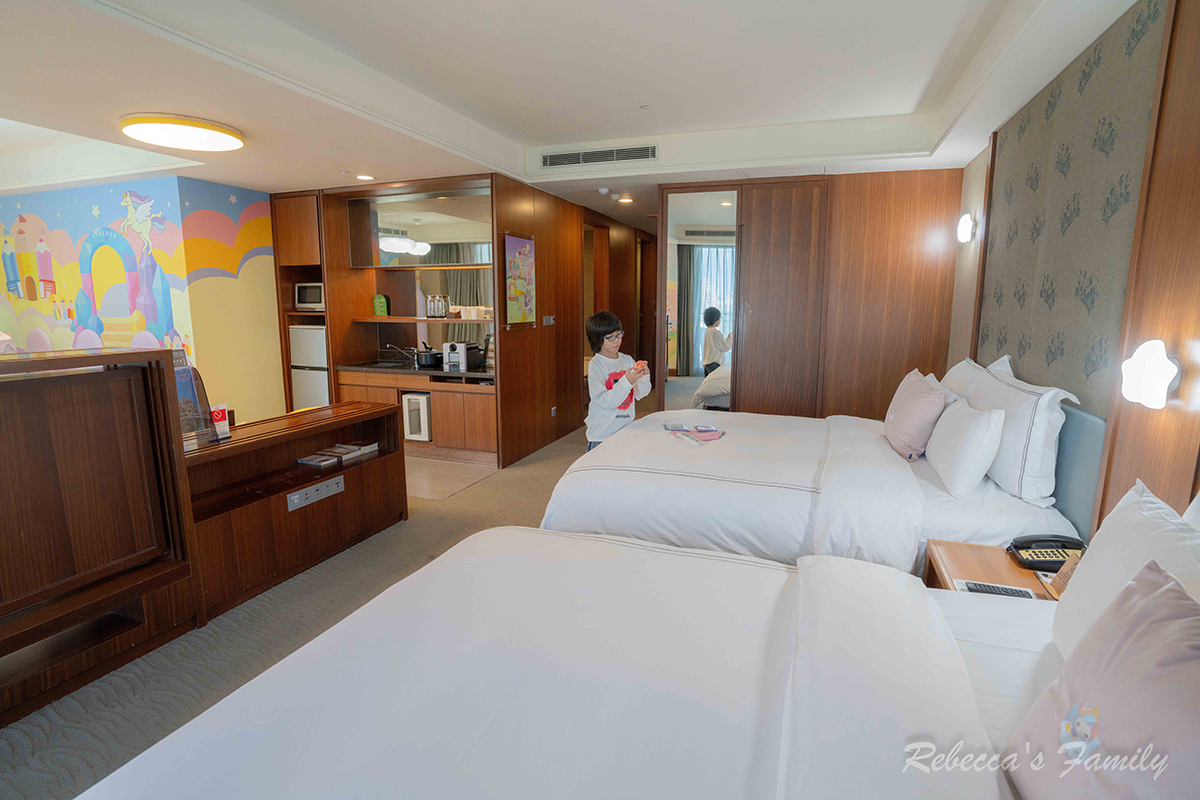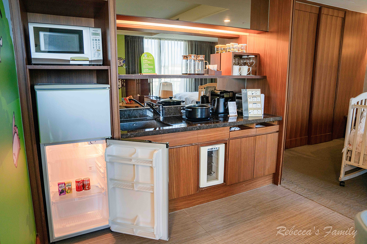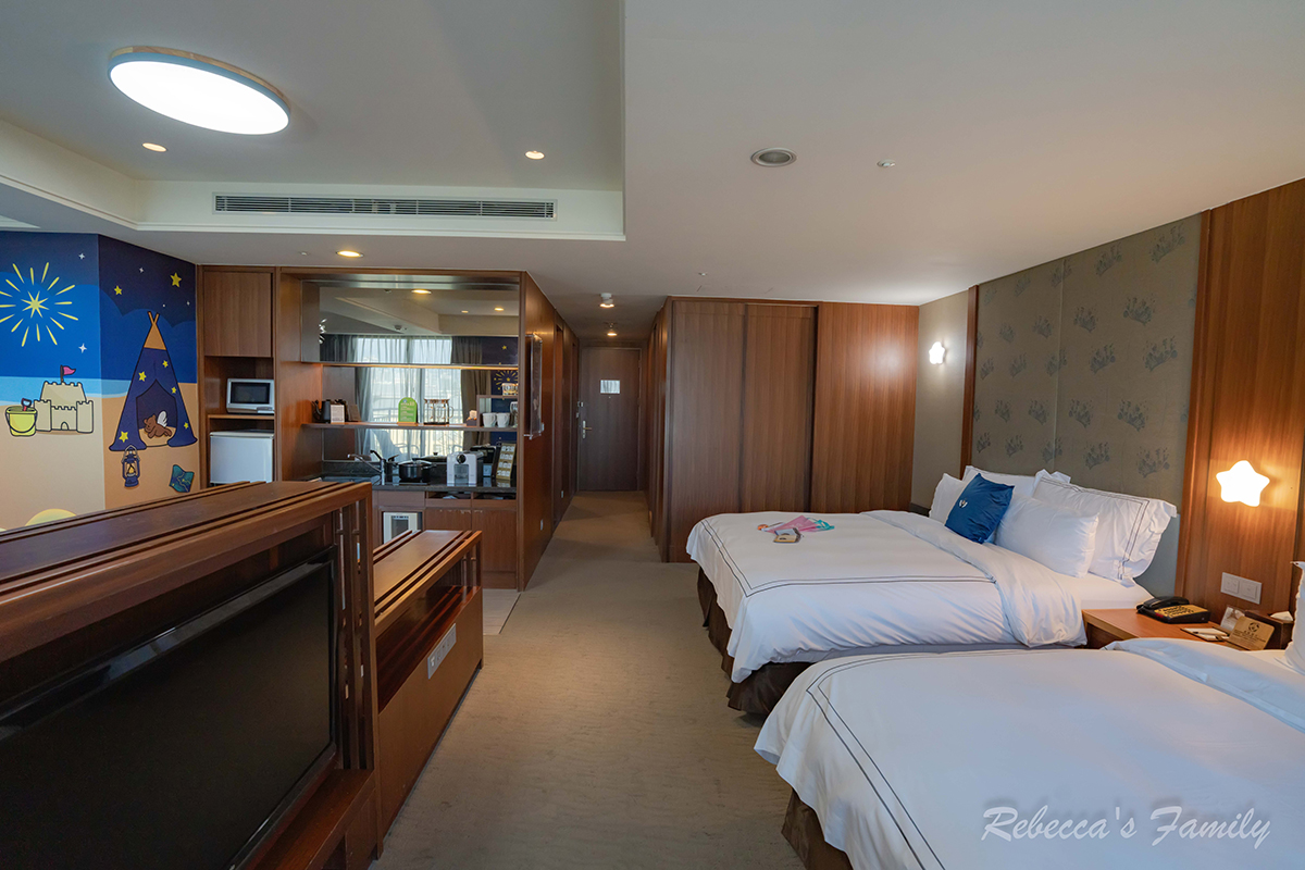 全館才三間的利百代主題房雖然都是面市景,但是房間坪數相對大很多,不僅都是兩大床的配置,附帶電磁爐、微波爐、餐具以及雙門冰箱的小吧台,三分之一的空間做為小朋友的遊戲區域。