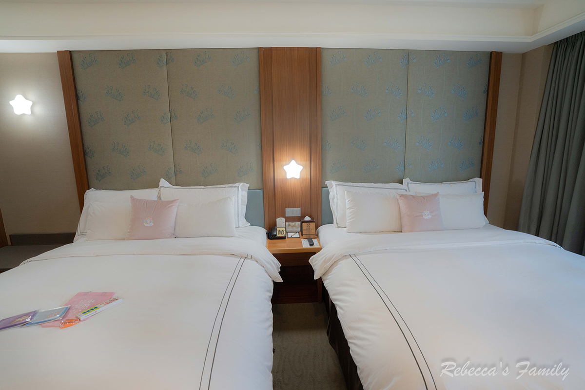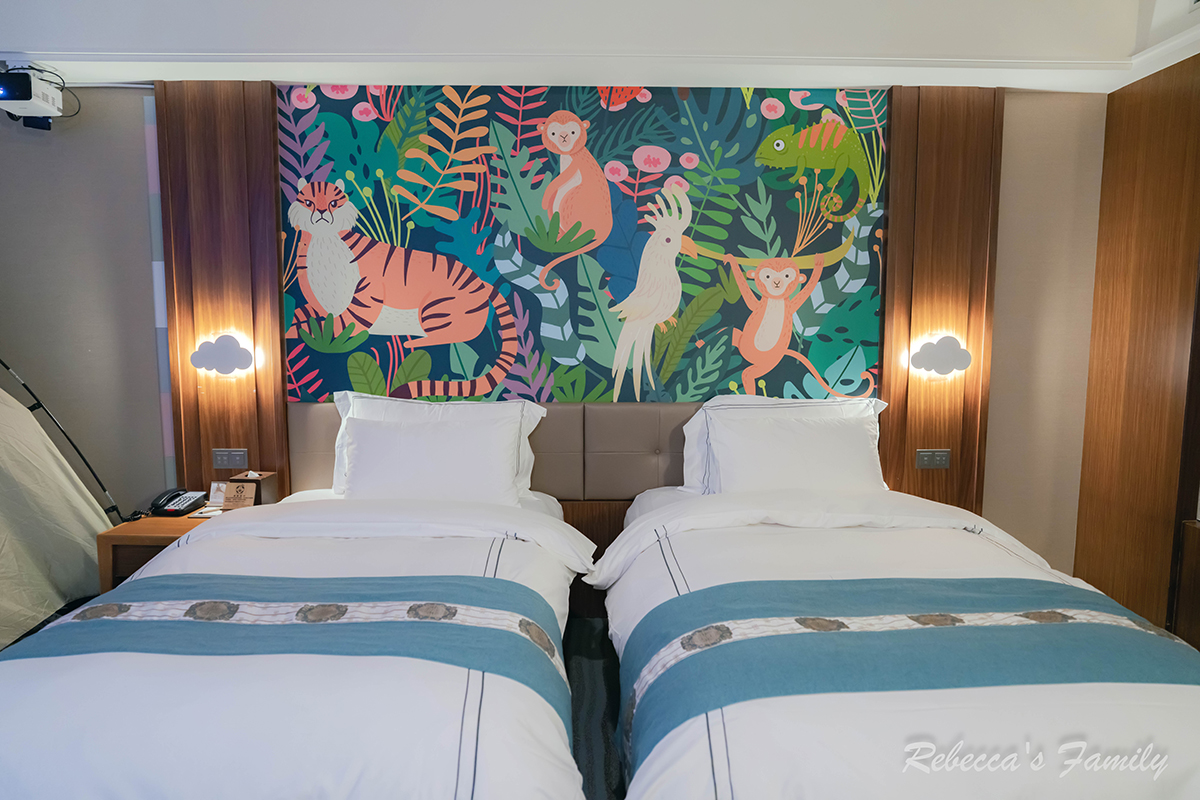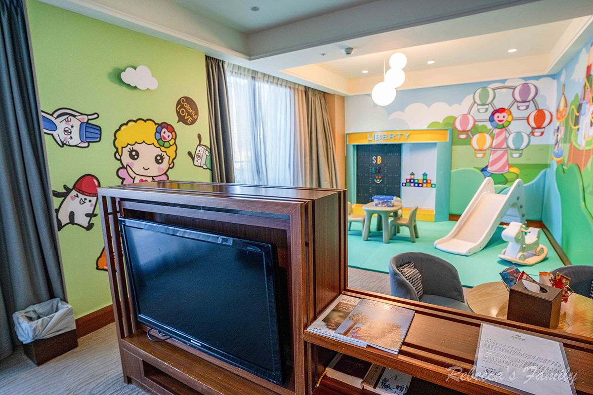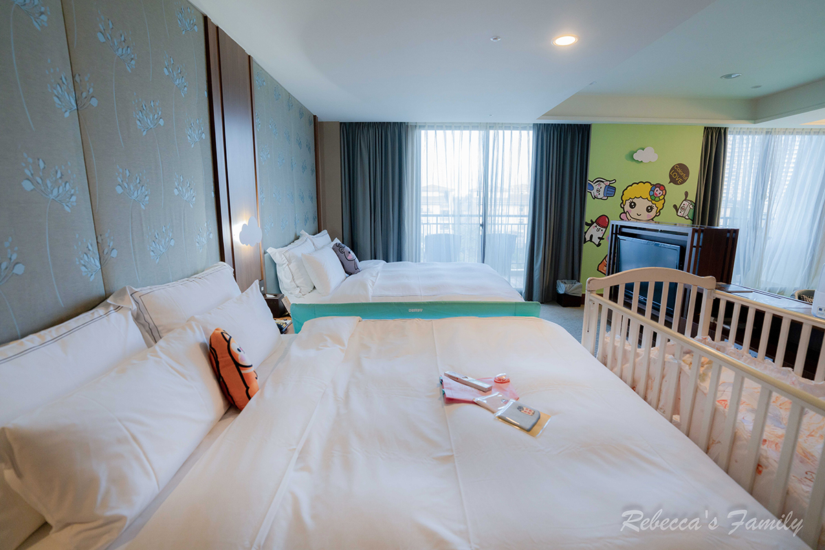 全館才三間的利百代主題房雖然都是面市景,但是房間坪數相對大很多,不僅都是兩大床的配置,附帶電磁爐、微波爐、餐具以及雙門冰箱的小吧台,三分之一的空間做為小朋友的遊戲區域。
