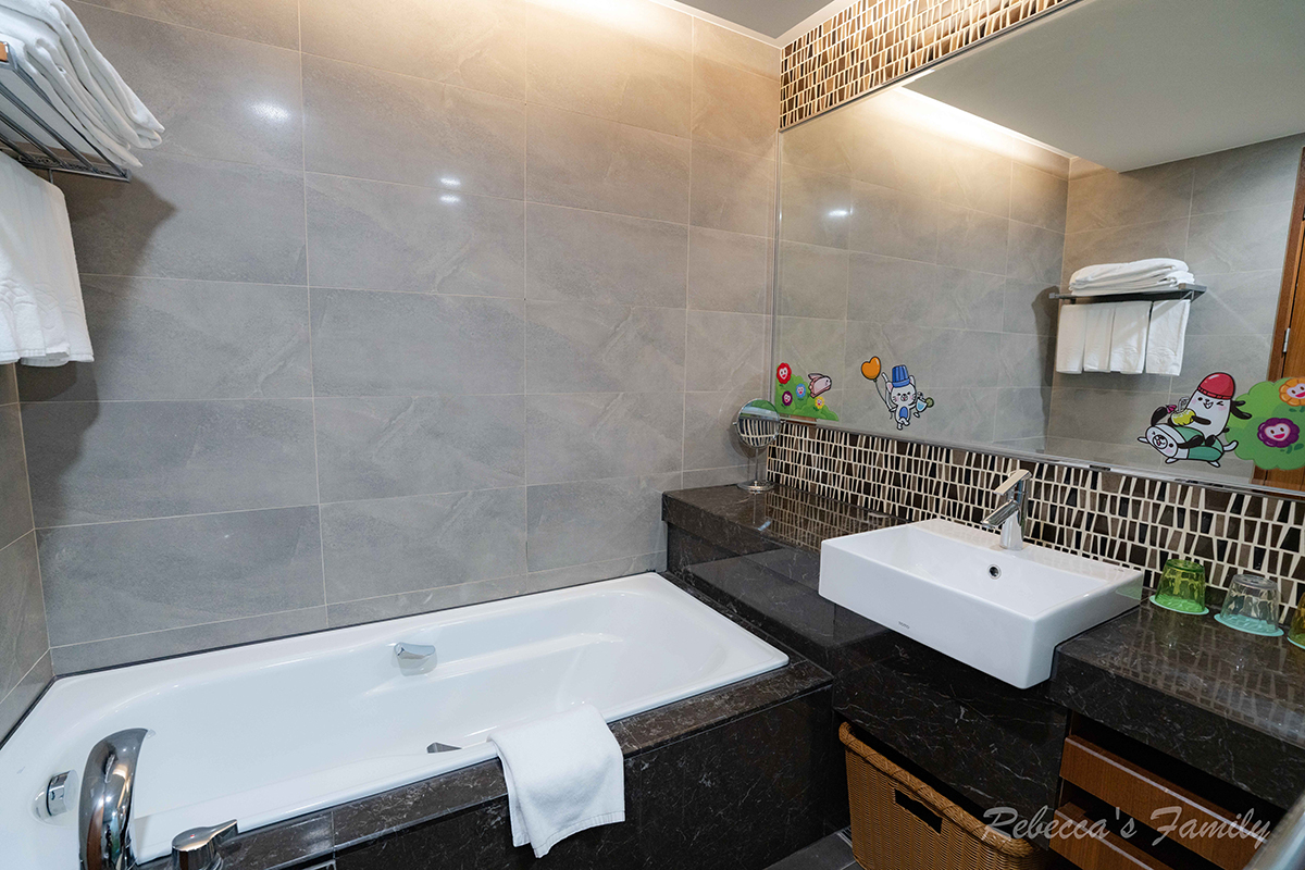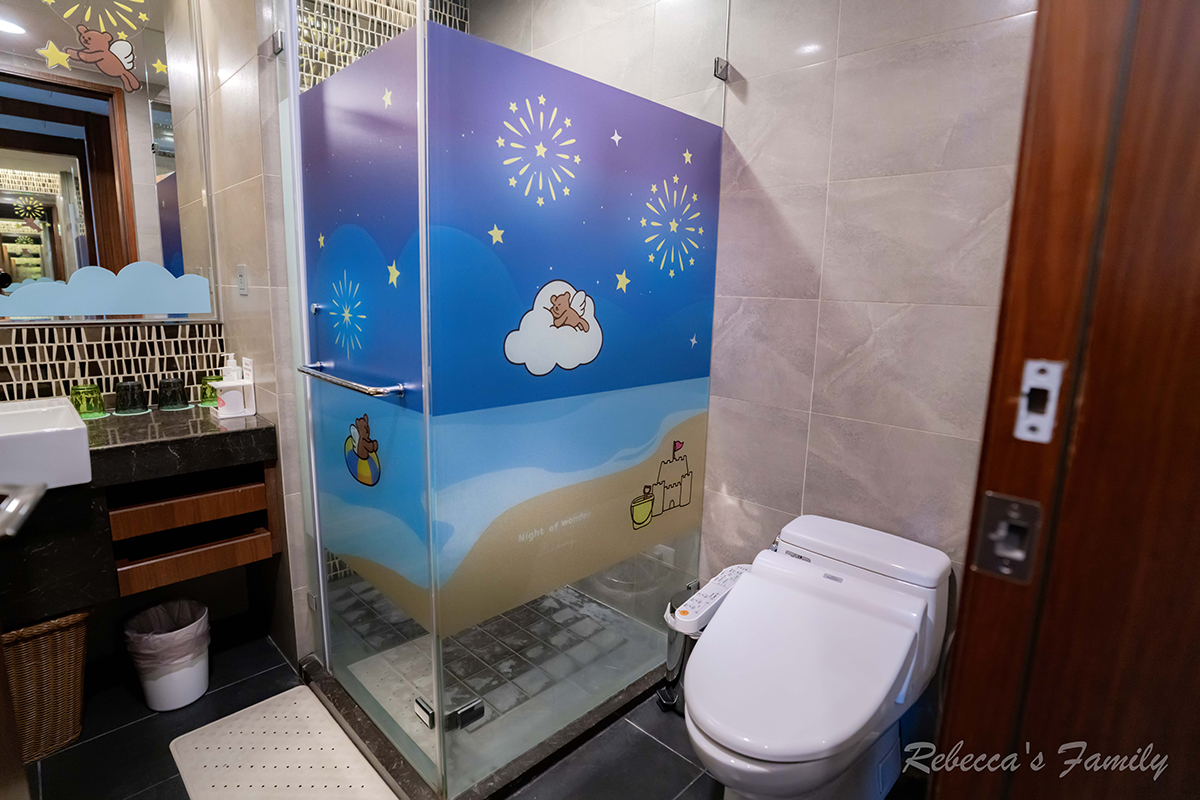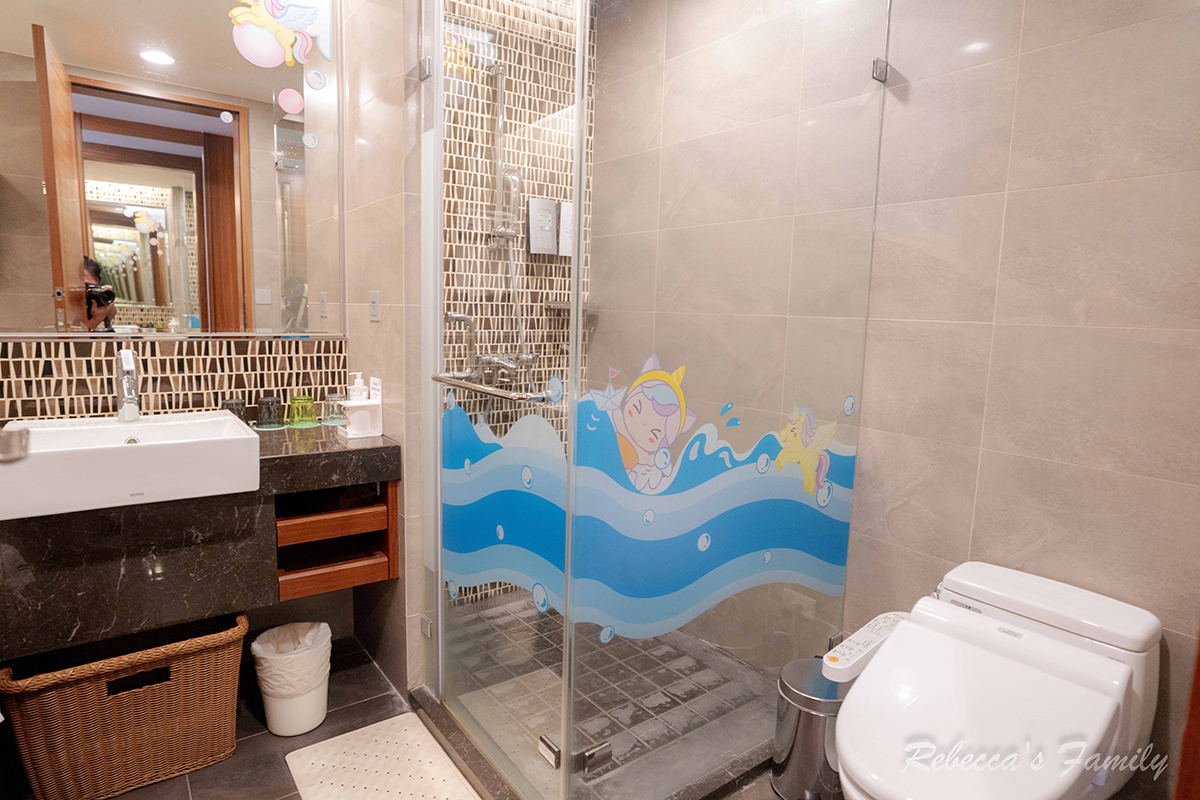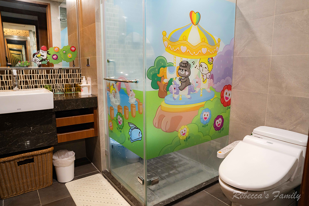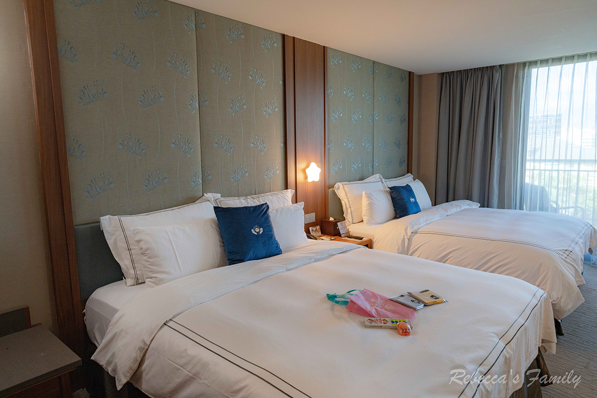 全館才三間的利百代主題房雖然都是面市景,但是房間坪數相對大很多,不僅都是兩大床的配置,附帶電磁爐、微波爐、餐具以及雙門冰箱的小吧台,三分之一的空間做為小朋友的遊戲區域。
