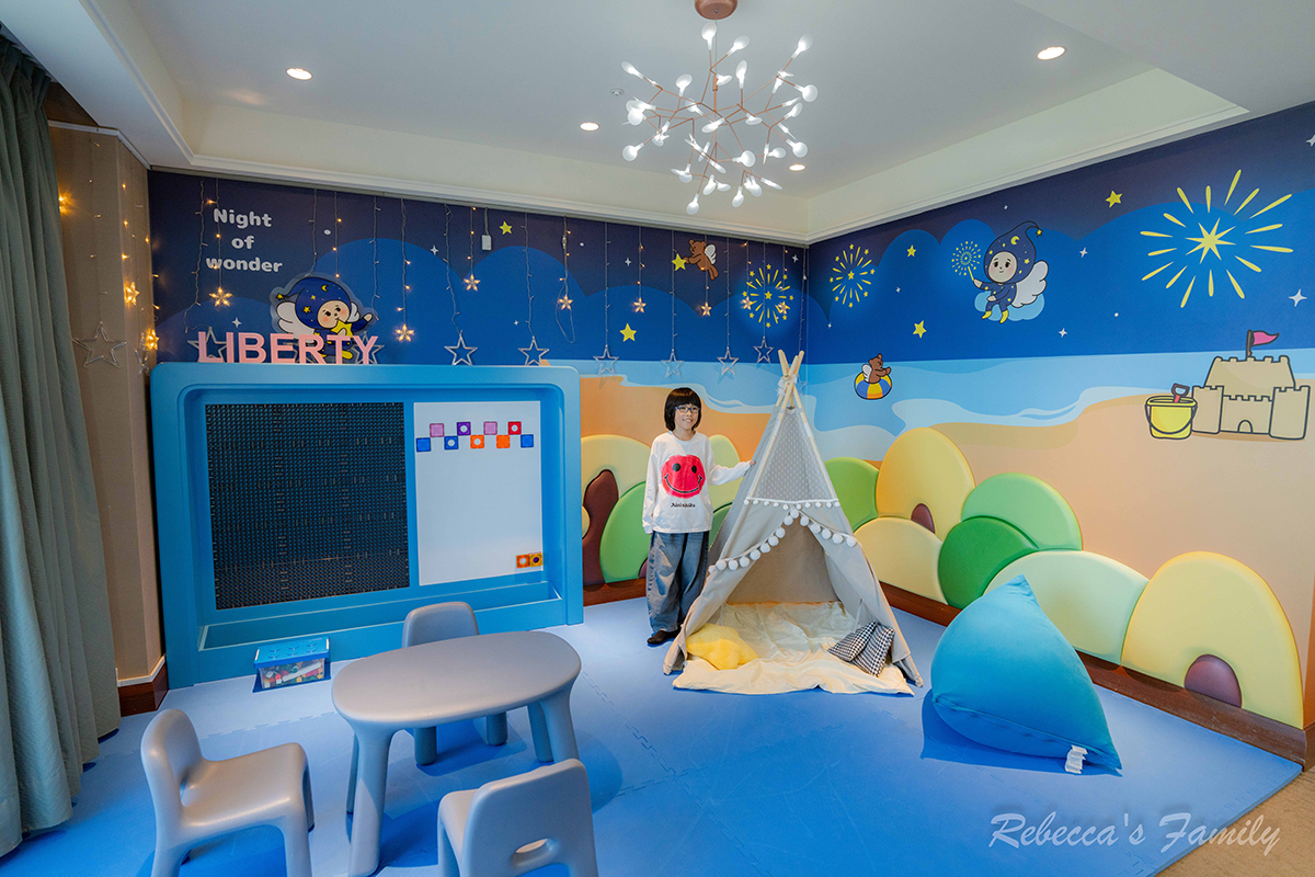 整個房間通透著水藍色的夜天使主題房,天花板掛著煙火造型燈,小帳棚、懶骨頭、積木玩具還有零食,絕對是小男孩的最愛。
