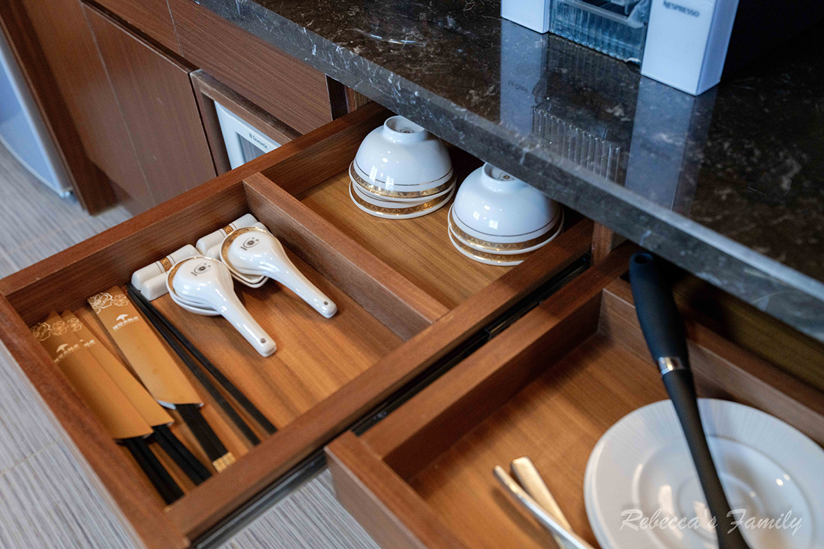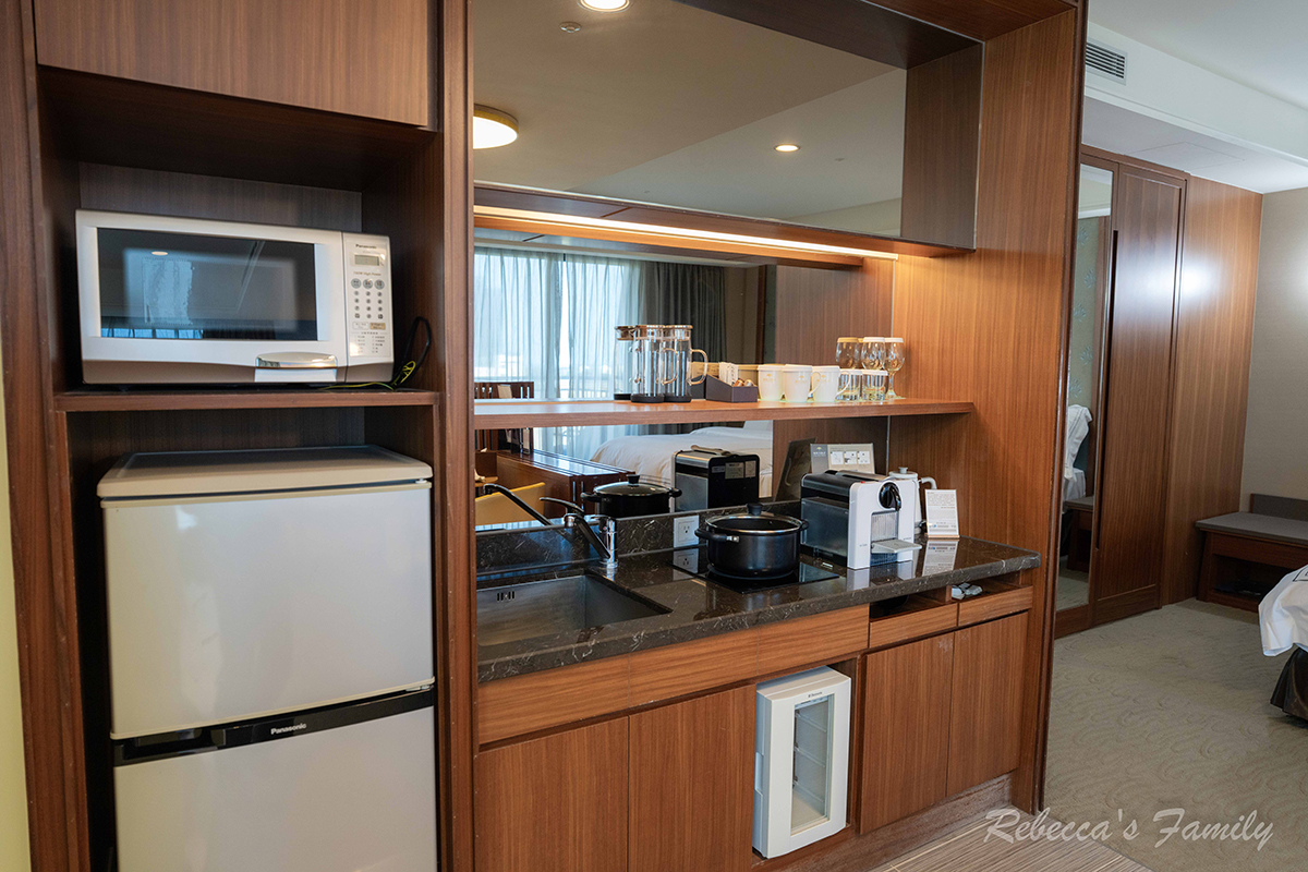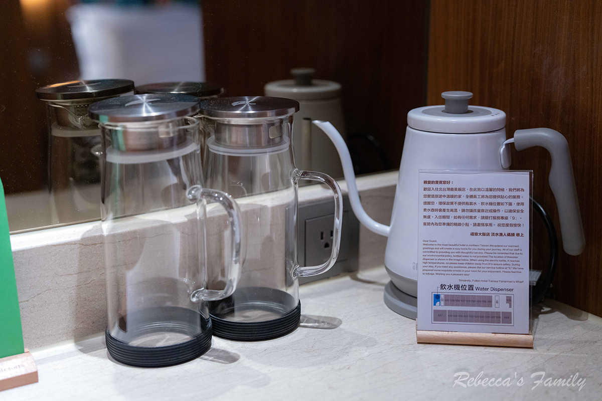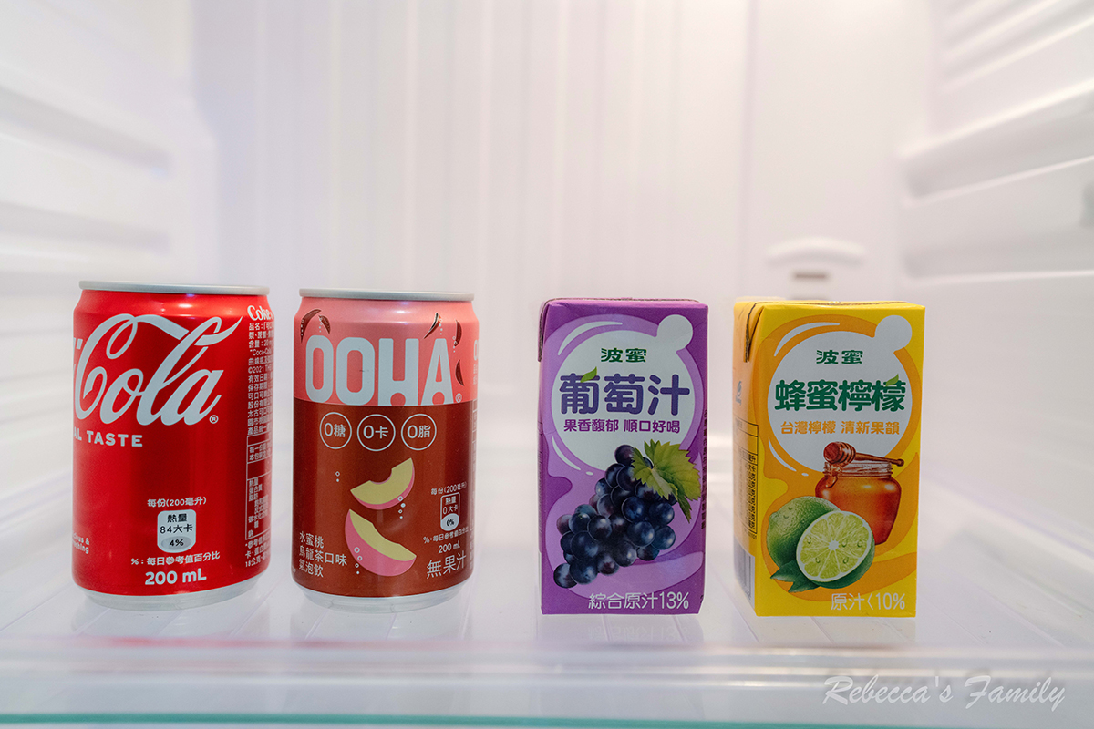零食籃、迎賓水果,簡易廚房附有電磁爐、湯鍋、微波爐、膠囊咖啡機、碗筷、湯瓢、酒杯、冷水壺(需自行到走廊的飲水機裝水)、電熱壺、雙門冰箱(附有免費飲料)