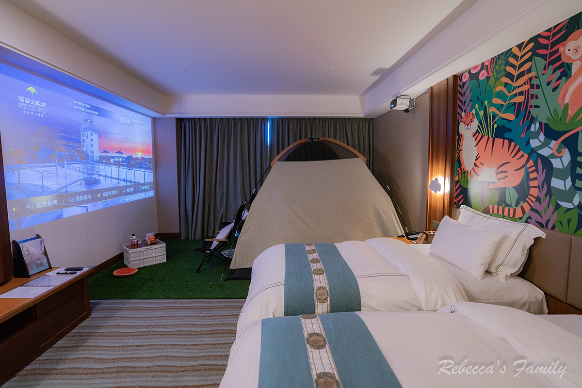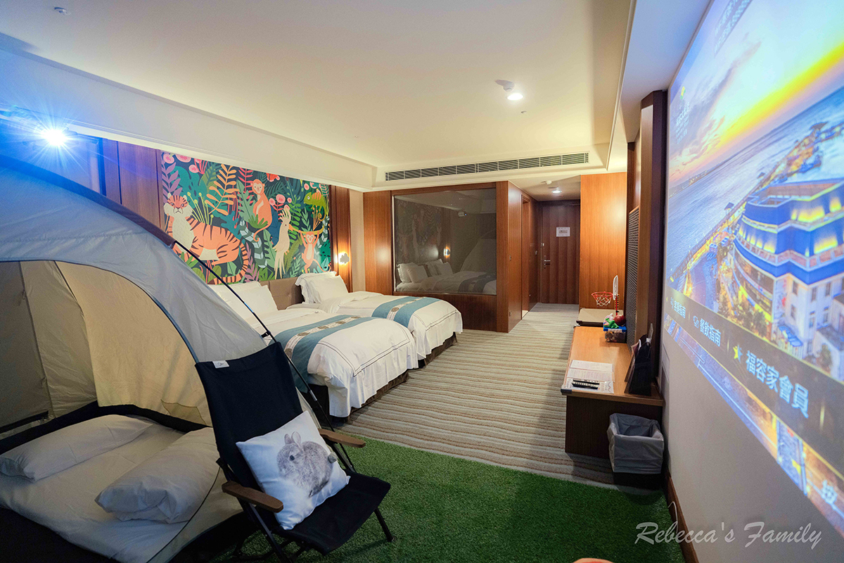 即日起,淡水福容的露營主題房陸續進行升級更新,房間不僅投影設備換新螢幕更大、解析力更好,就連牆壁裝潢圖案也換成了森林動物,恐龍圖示的房號標誌更顯可愛。