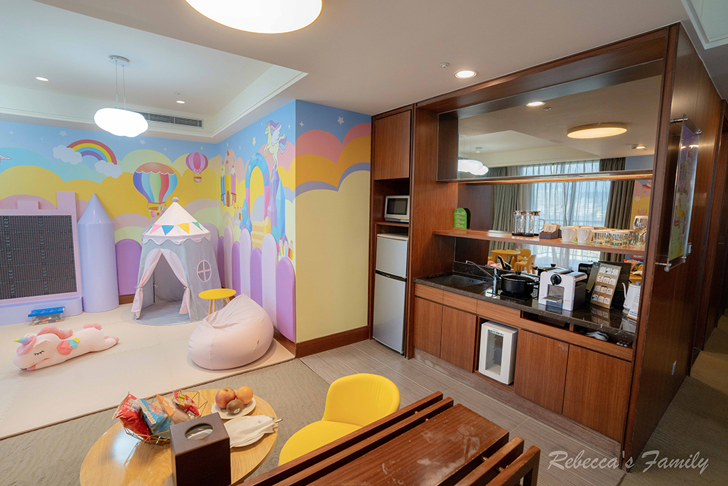 這三間雖然都是市景房,但坪數大很多,兩大床+小吧台(電磁爐、微波爐、餐具、雙門冰箱),而且約三分之一空間直接做成孩子的遊戲區,小朋友一進房就開玩,爸媽超輕鬆。