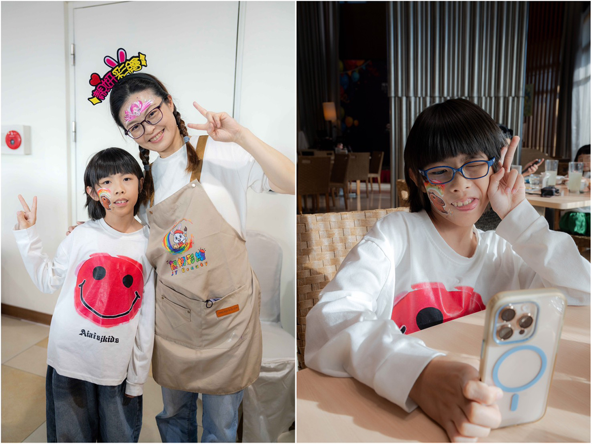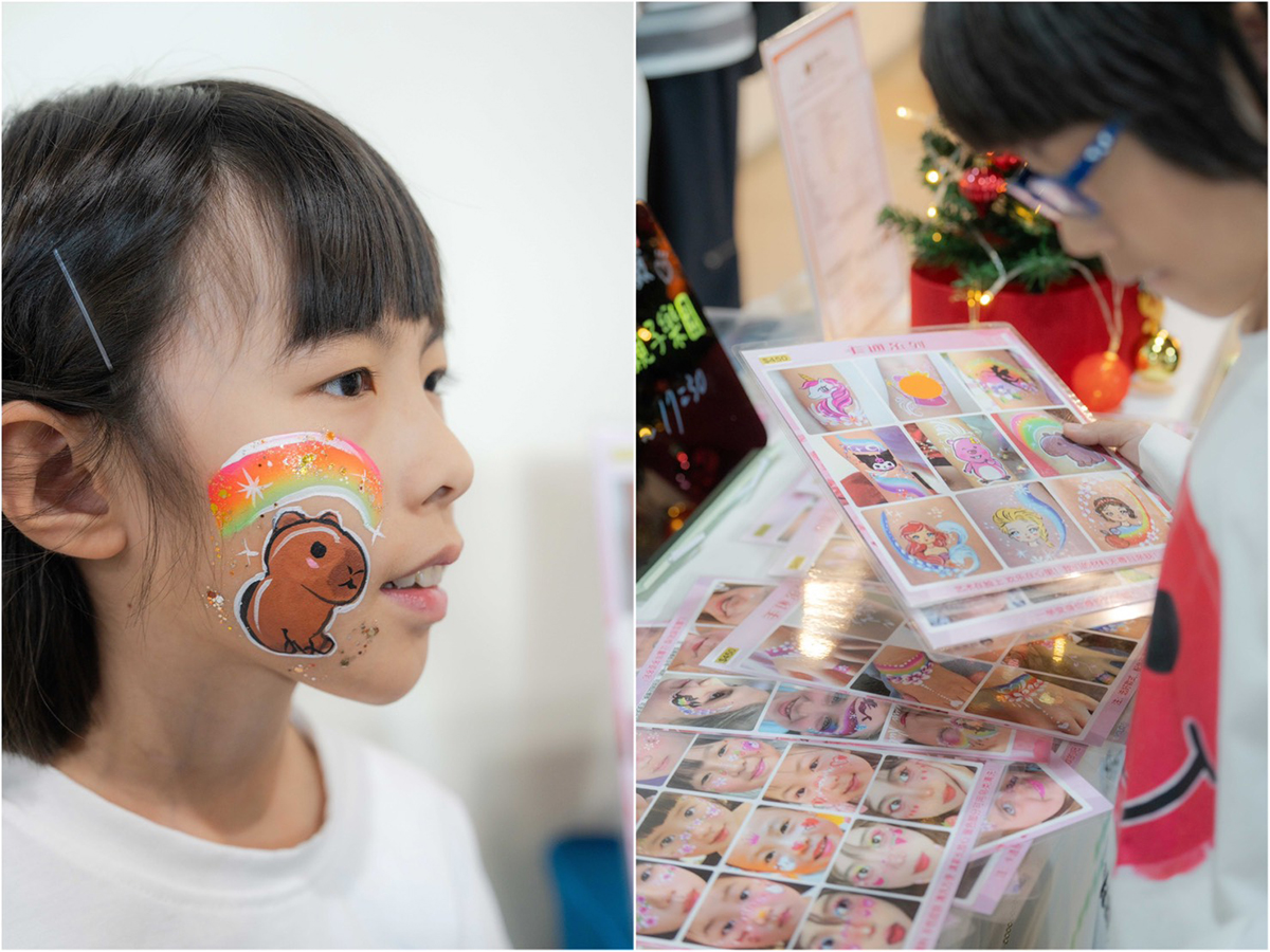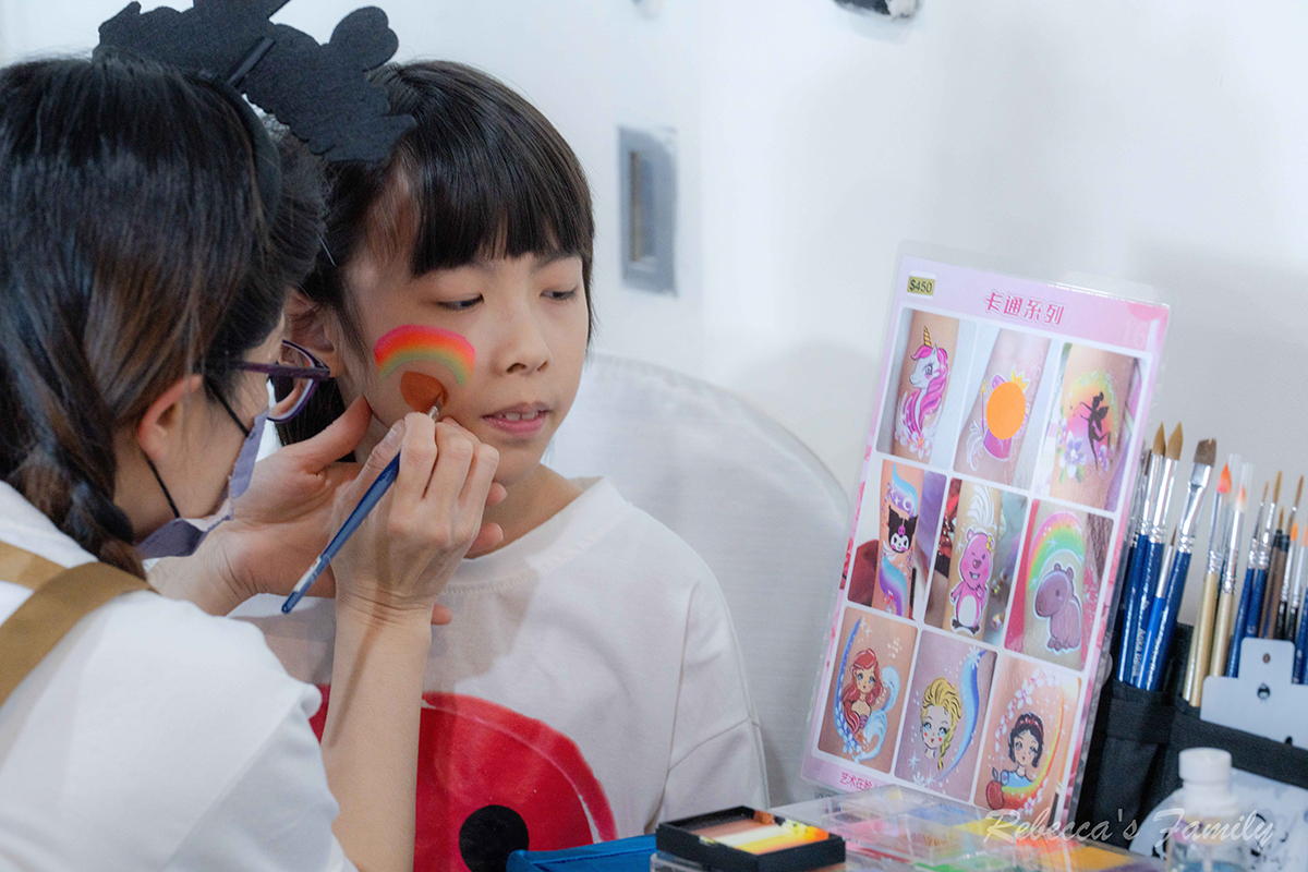 採用安全的水性顏料,用濕紙巾就能擦掉,也能額外加價100元選用防水款顏料。價格從350元至500元都有,依照圖案難度不同。喜歡超級英雄的恩寶居然挑了一隻可愛的卡比巴拉畫在臉頰上。