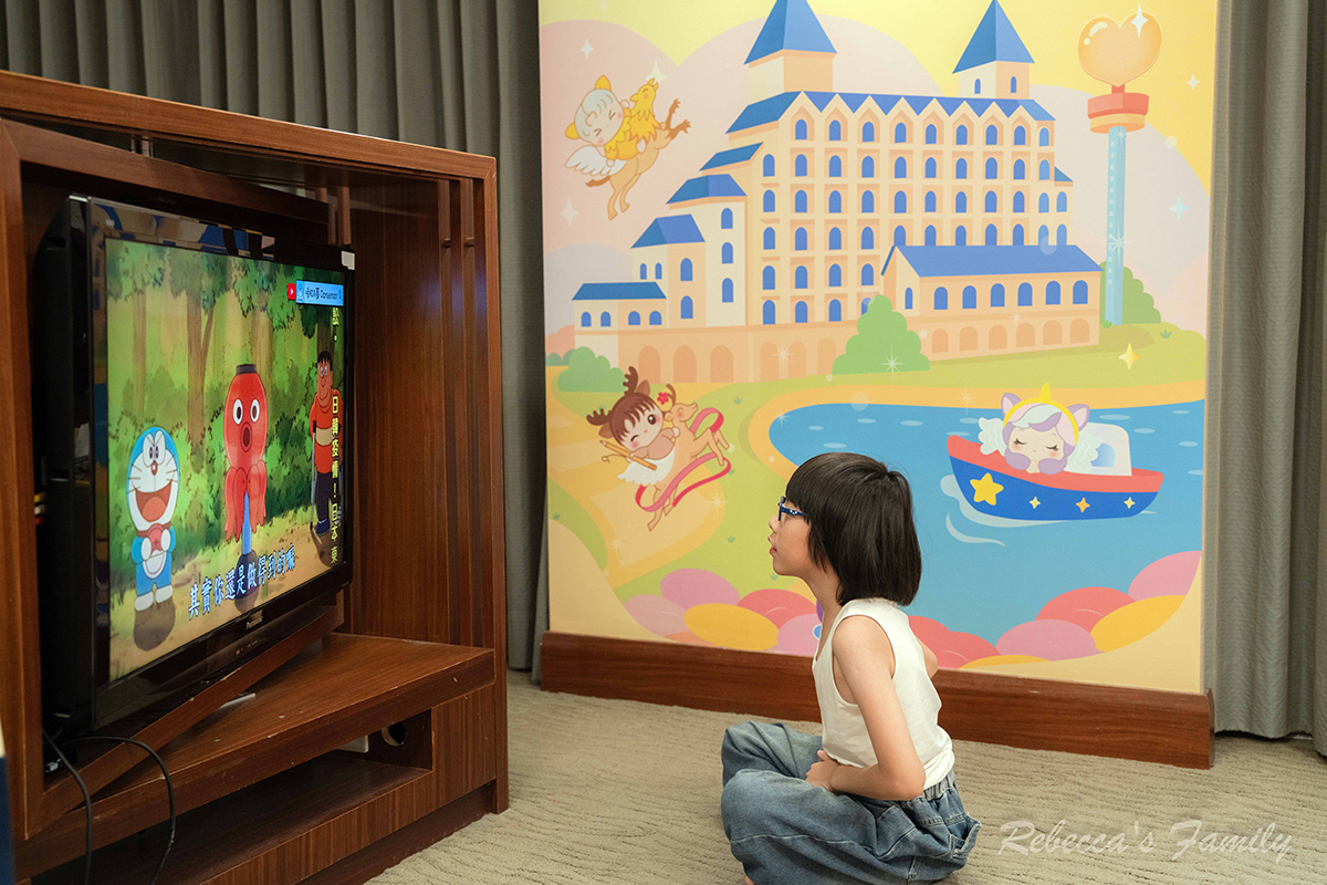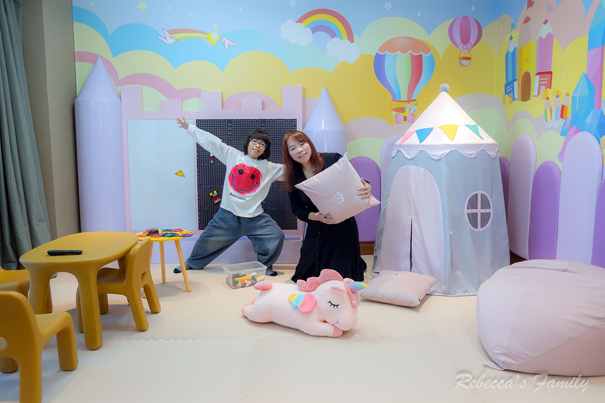瑞貝卡入住的是以粉紫為色彩基調的「Q比天使」,23坪,兩大床附加主題抱枕,床頭燈可切換黃、白光。雙材質的地毯鋪面,遊戲區有減震泡棉墊。雲朵造型燈、小帳棚、兒童桌椅、彩虹獨角獸娃娃、懶骨頭,牆邊有蠟筆造型城堡塔樓、積木牆跟磁力片可以玩。恩寶直接把房間的零食籃、懶骨頭、獨角獸娃娃還有自己的玩具,不只全塞進小帳棚裡面,還拉到電視機前面,恩寶:「因為這樣看電視比較爽!」