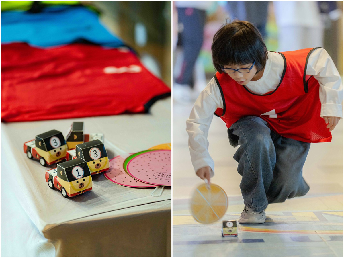 用扇子搧風驅動小車向前衝,通過終點就能換到小禮物。