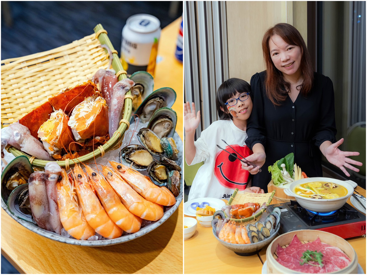 用豬骨、雞骨、南瓜長時間熬製入口溫潤且濃郁的湯頭,再端出秋蟹海鮮船、澳洲和牛盤、新鮮蔬菜籃。我覺得以一家四口來說,火鍋搭配自助吧絕對吃得又飽又巧。