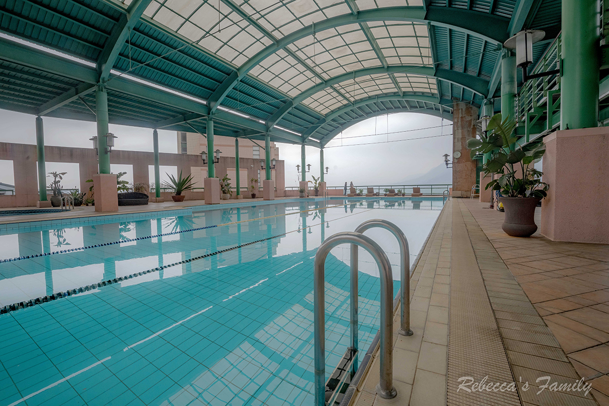半露天式的泳池有挑高綠色拱頂,可以遠眺大壩跟對面山景,映照碧綠水色看去就很有度假fu。