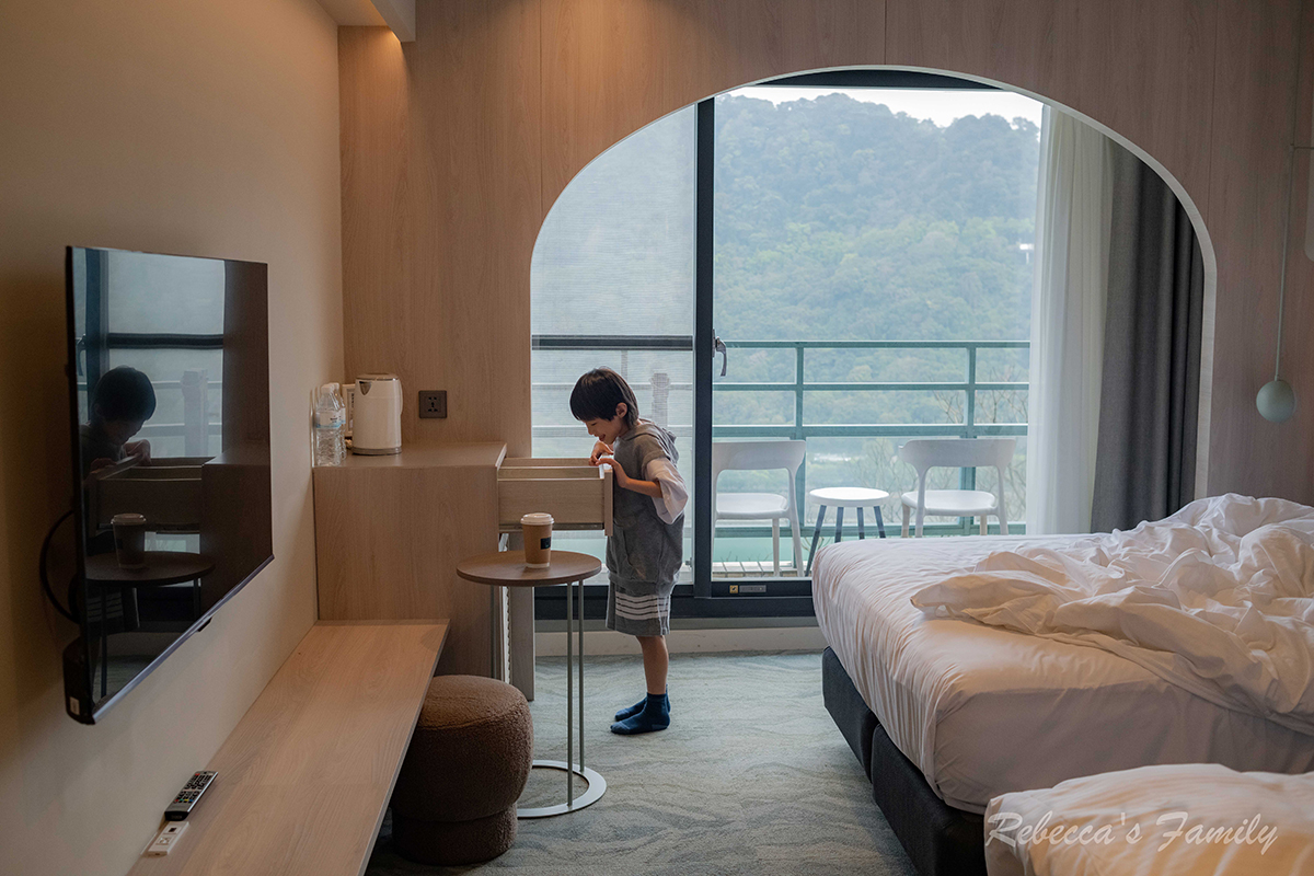 湖水綠的床邊小燈、淺色調木質家具都在呼應石門水庫的風景特色,優雅中帶有時尚,看得出飯店的用心。