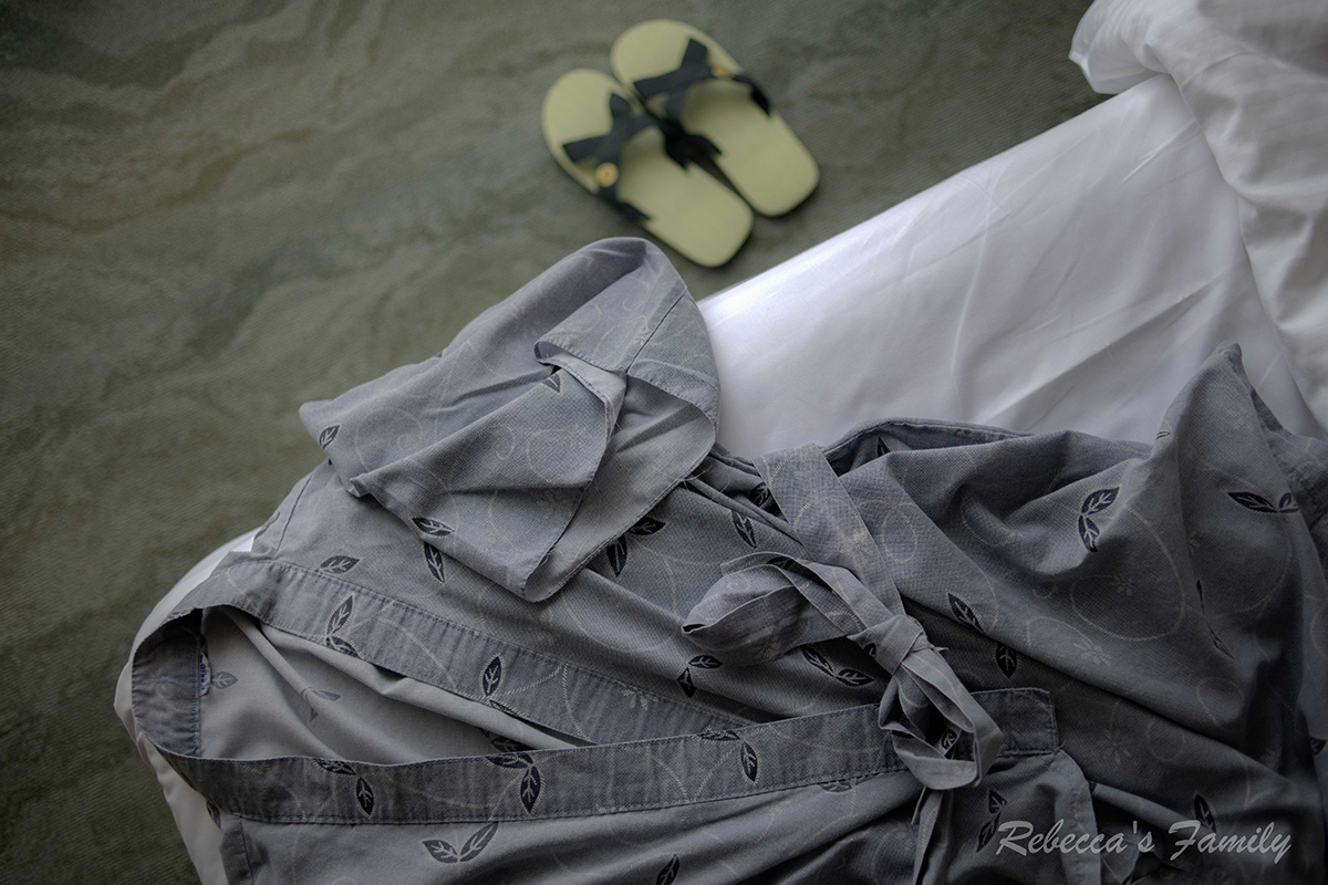 飯店的拖鞋和浴衣。拖鞋很好穿,比起其他飯店的白色拋棄式拖鞋,這個太有質感了。
