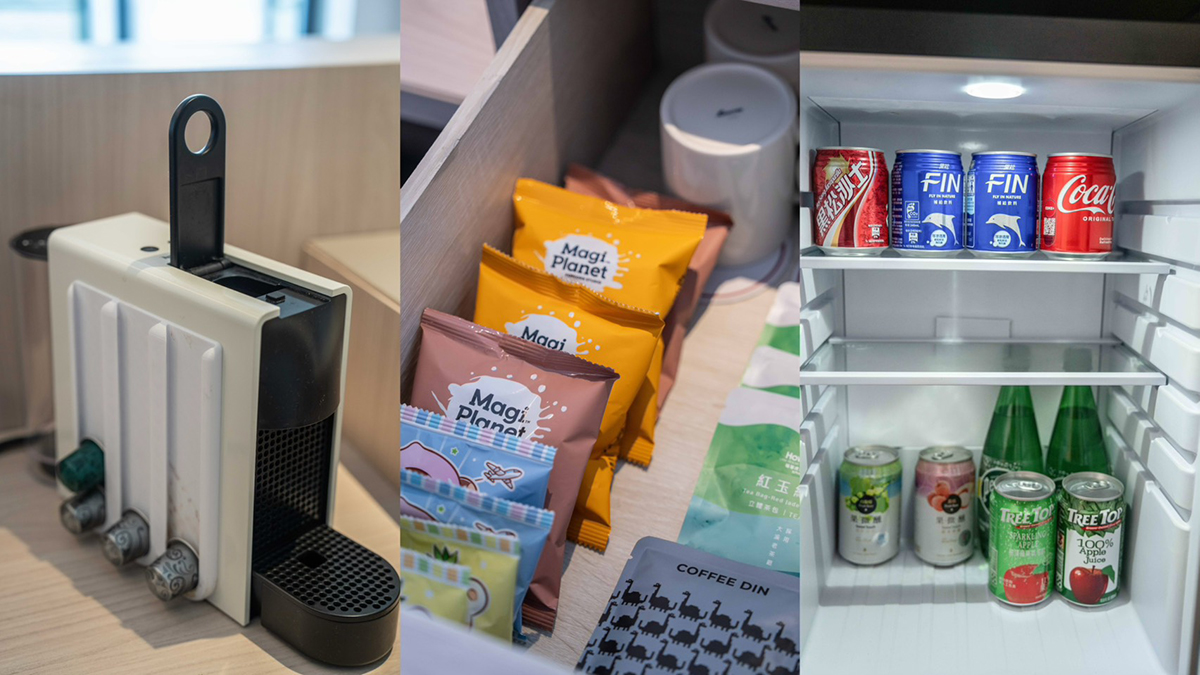 飯店會依據房型的位階價格,提供不同的minibar服務。整套茶具搭配大溪老茶廠的原片茶葉,小冰箱裡提供水果啤酒、法國氣泡水以及軟性飲料,還有堅果、龍潭花生糖、爆米花等零嘴,這些全都免費享用。如果需要飲用水或熱水可至走廊設置的飲水機取用。