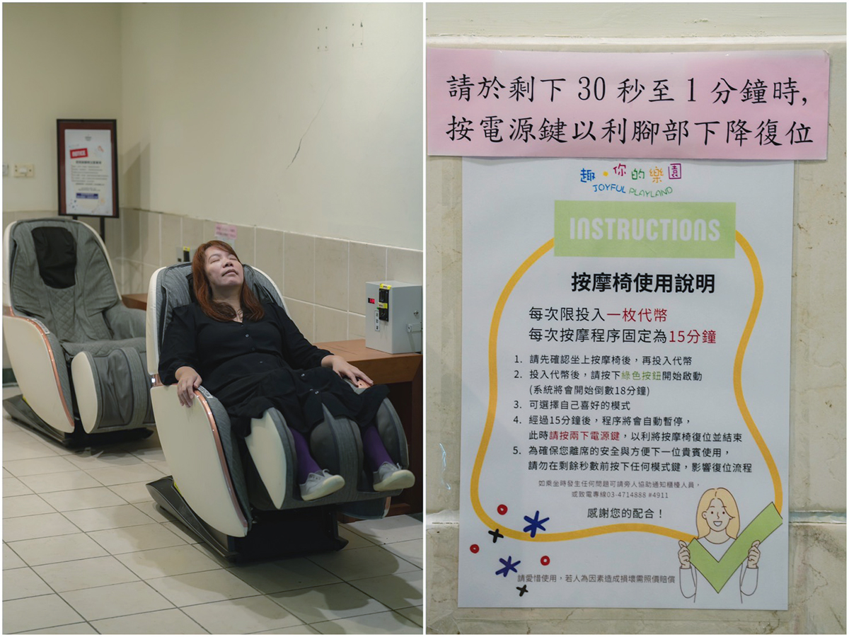 按摩椅設在進泳池入口的附近。使用前須向櫃台索取代幣,人多時須按登記順序候位;每人一次限領一枚代幣,每枚代幣可享18分鐘的按摩行程。