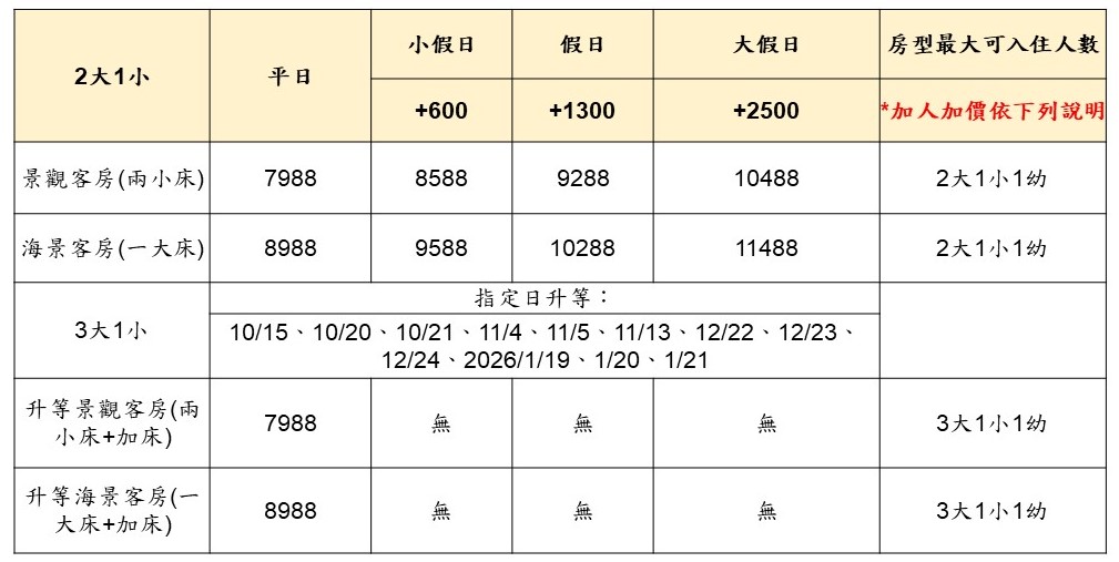 一般日超過2大1小或指定日升等加床超過3大1小組合,請於訂單代轉欄位備註或去電飯店 (03-977-1166 #1) 備註,加人加價費用現場付款。
