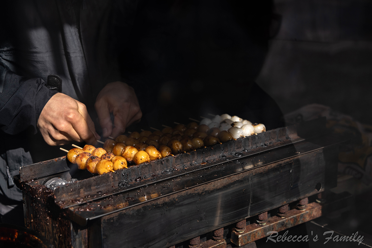 恩寶超喜歡吃糰子串,不過日本跟台灣的糰子吃法不太一樣,日本大多是塗上用醬油、砂糖、味醂調製而成的醬汁,焦香帶些鹹甜是一大特色;而台灣比較常用黑糖醬吃起來甜甜的。
