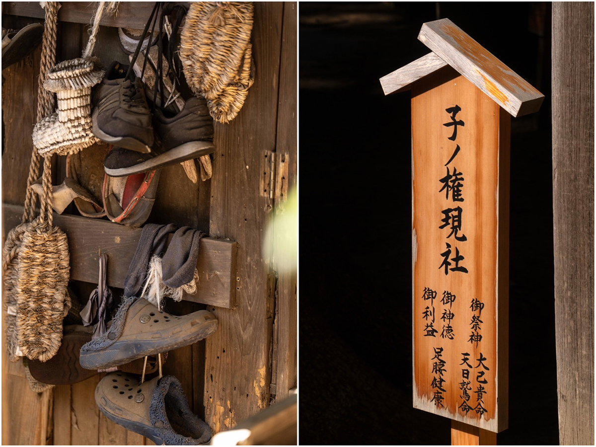 這裡的神明也是各司其職,負責庇佑的職掌各有專精,像是這位神明就是保佑人們身體平安、健步如飛,所以人們紛紛把自己穿的鞋子掛在神龕旁。