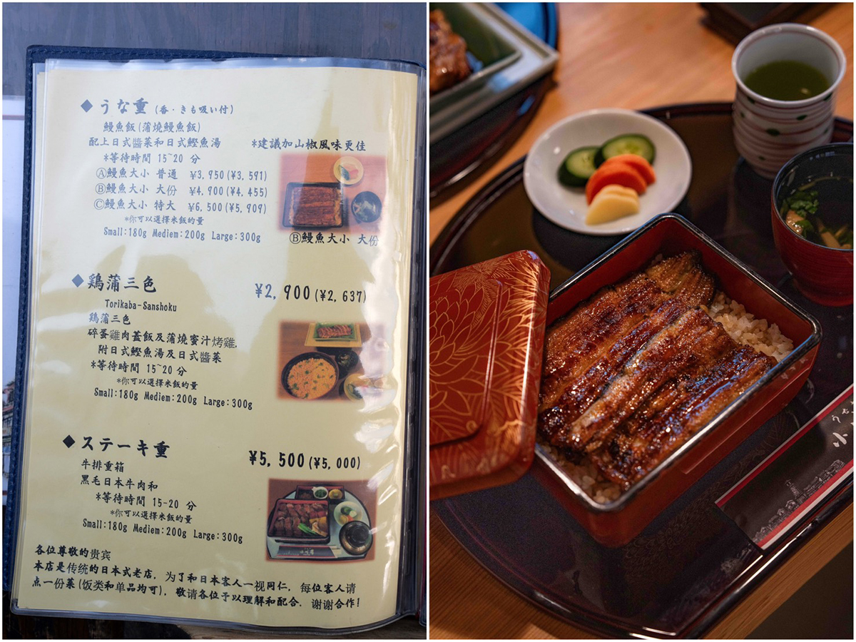 招牌菜是「鰻重」,「鰻重」 (うなじゅう, Unaju) 是指將蒲燒鰻魚鋪在白飯上,裝在精緻的方形的重箱(漆器便當盒) 裡,與裝在碗裡的「鰻丼 (unadon)」的區別在於容器和份量,鰻重更講究擺盤與儀式感,份量也通常更足、更豪華。
