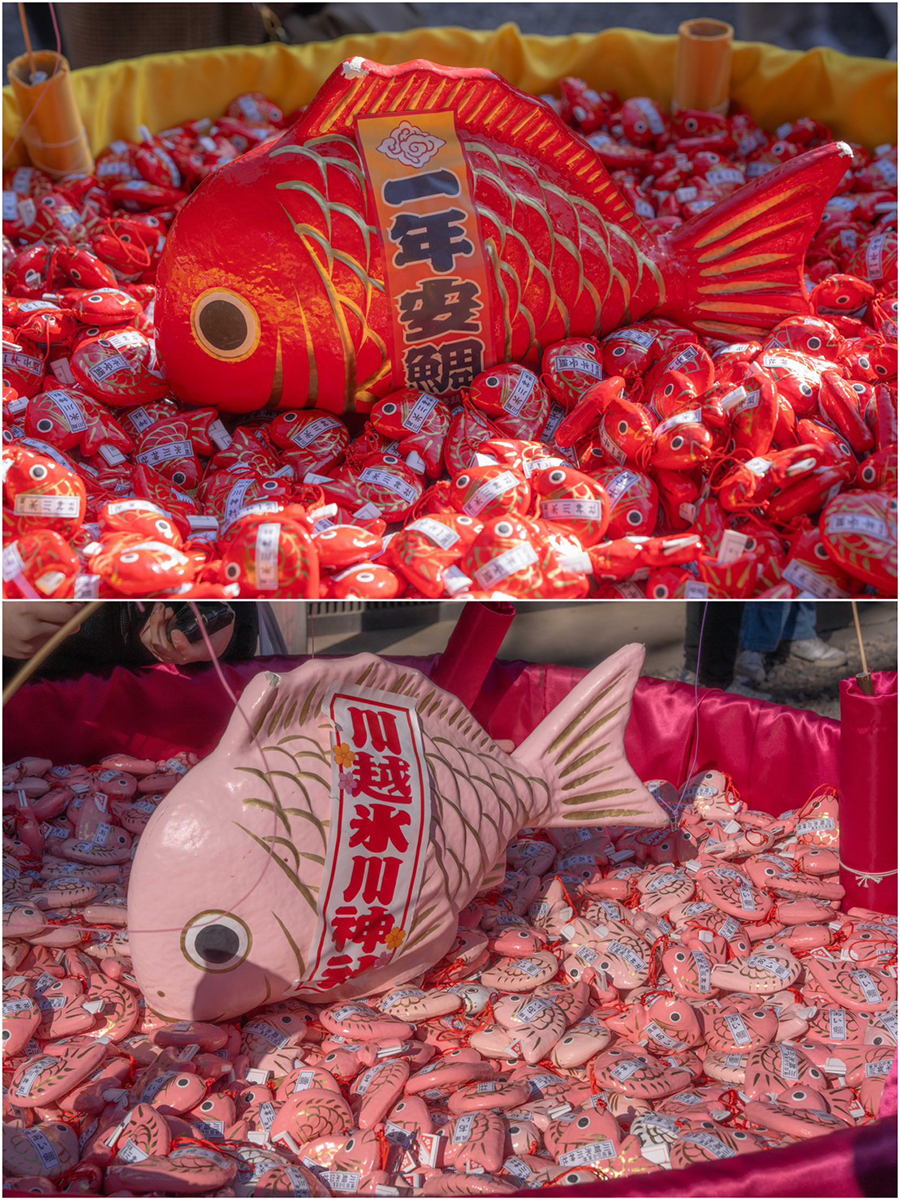 粉色的鯛魚是求姻緣、紅色的是保平安。在整個廣場,除了釣祈福鯛魚之外,還有很多可以讓你玩祈福的玩意。