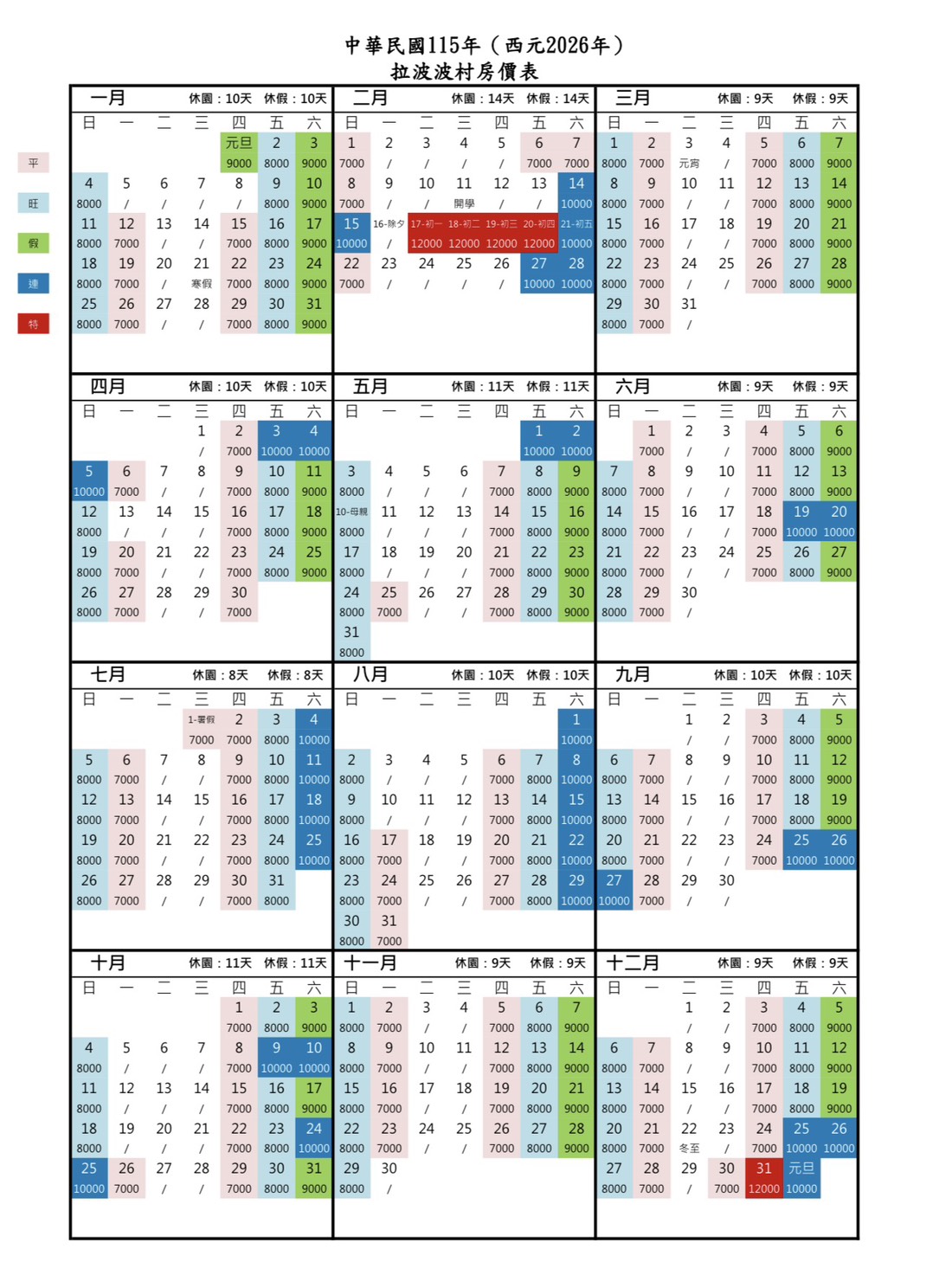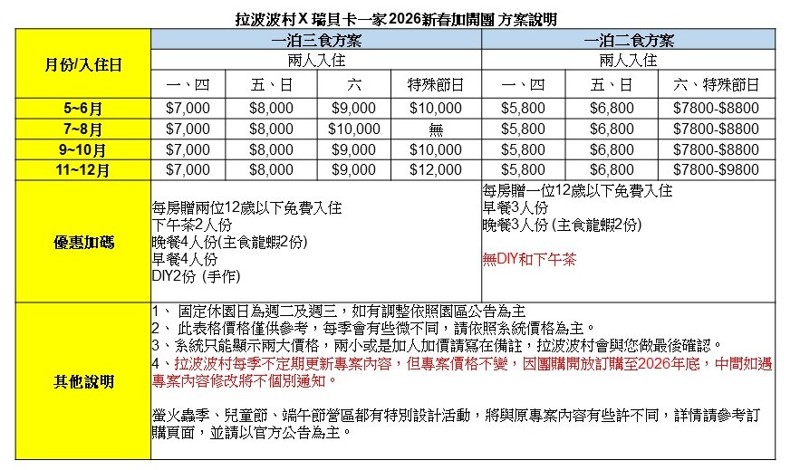 提醒您:預訂完成後最晚請於入住日一週前,加入拉波波村官方LINE好友並填寫行前確認表單 lin.ee/VlxGp8p ※ 實際入住人數可於表單內填寫並告知飲食禁忌 ※