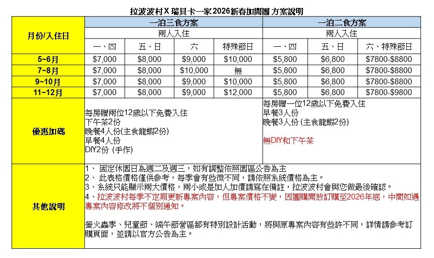 入住拉波波村搭配瑞貝卡團購方案,享有一泊二食和一泊三食的優惠價格,其實價格沒有差大多,我建議選一泊三食比較划算。