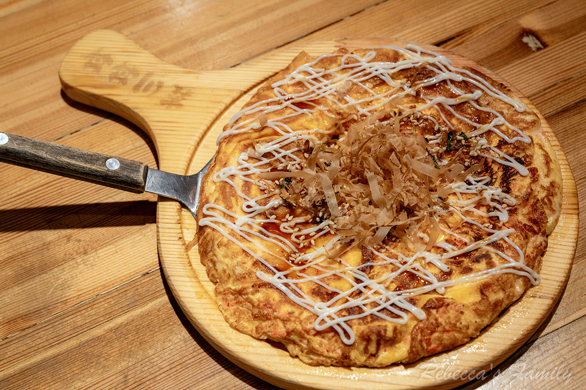 看似平常不過的烘蛋,淋上美乃滋醬跟柴魚片香味四溢。一口咬下可以感覺得到魚卵的啵啵口感,加上濃郁的起司,配飯、下酒都很合適。