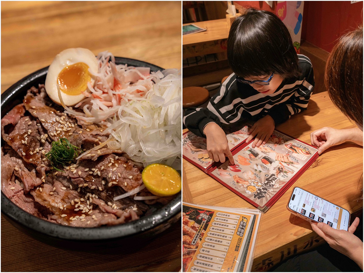 我們點了無骨牛小排丼飯、明太子起司烘蛋、鮪魚壽司兩貫、魚蛋沙拉、蘆筍蝦手卷、天使紅蝦味增湯、蛤蠣味增湯、酥脆雞皮串,外加一個小玻璃可樂,我們兩大一小一共花了1140元。