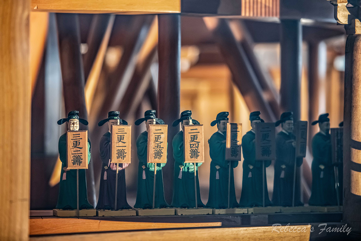 每逢奇數鐘點紅色木偶會搖鈴、偶數鐘點紫色木人敲鐘,每15分鐘(一刻)綠色木人會擊鼓,並用木人舉牌顯示時間。