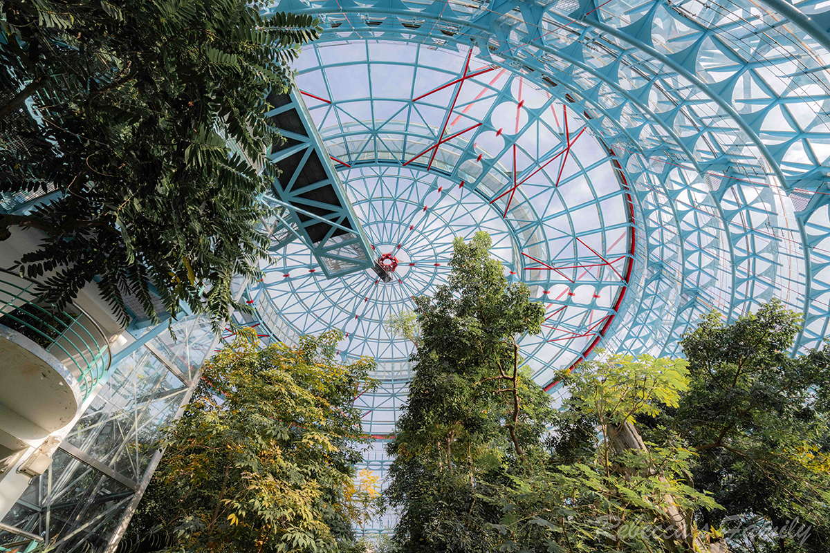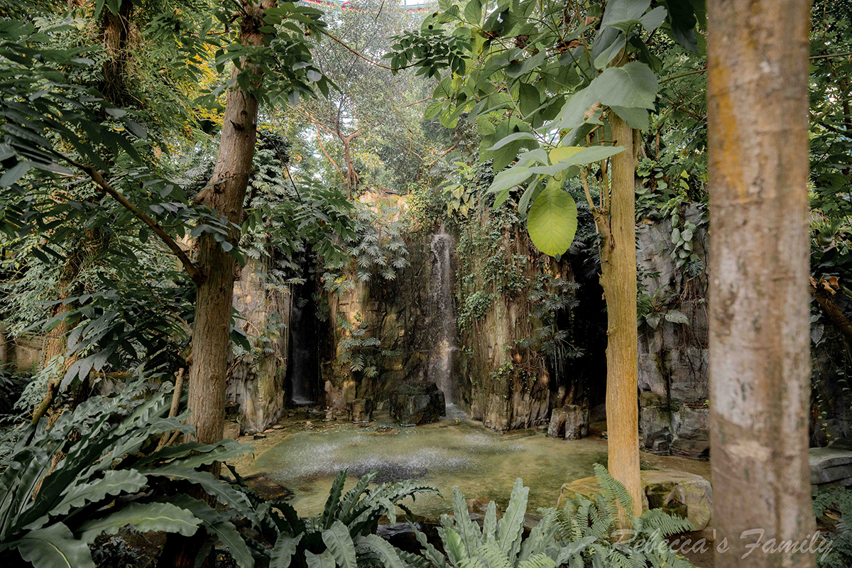 裏頭除了人工瀑布之外,從40公尺高的鋼構穹頂還有垂直水瀑宛如一間超大溫室。