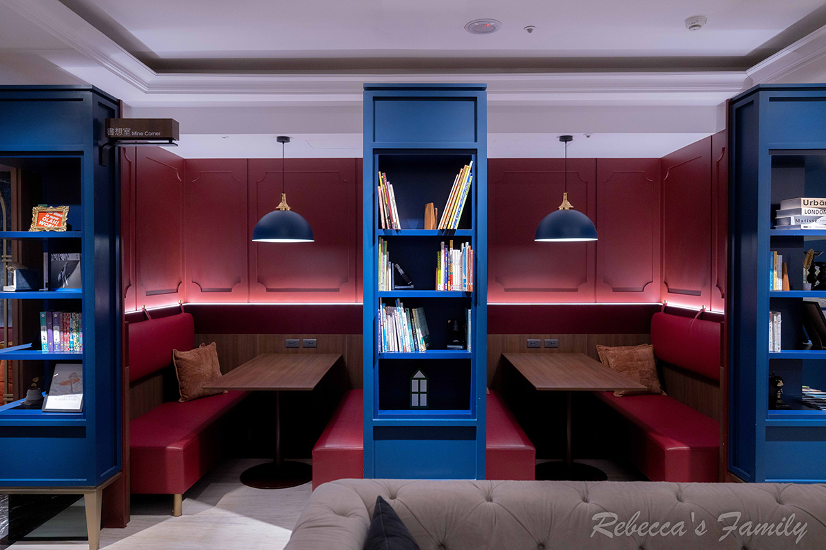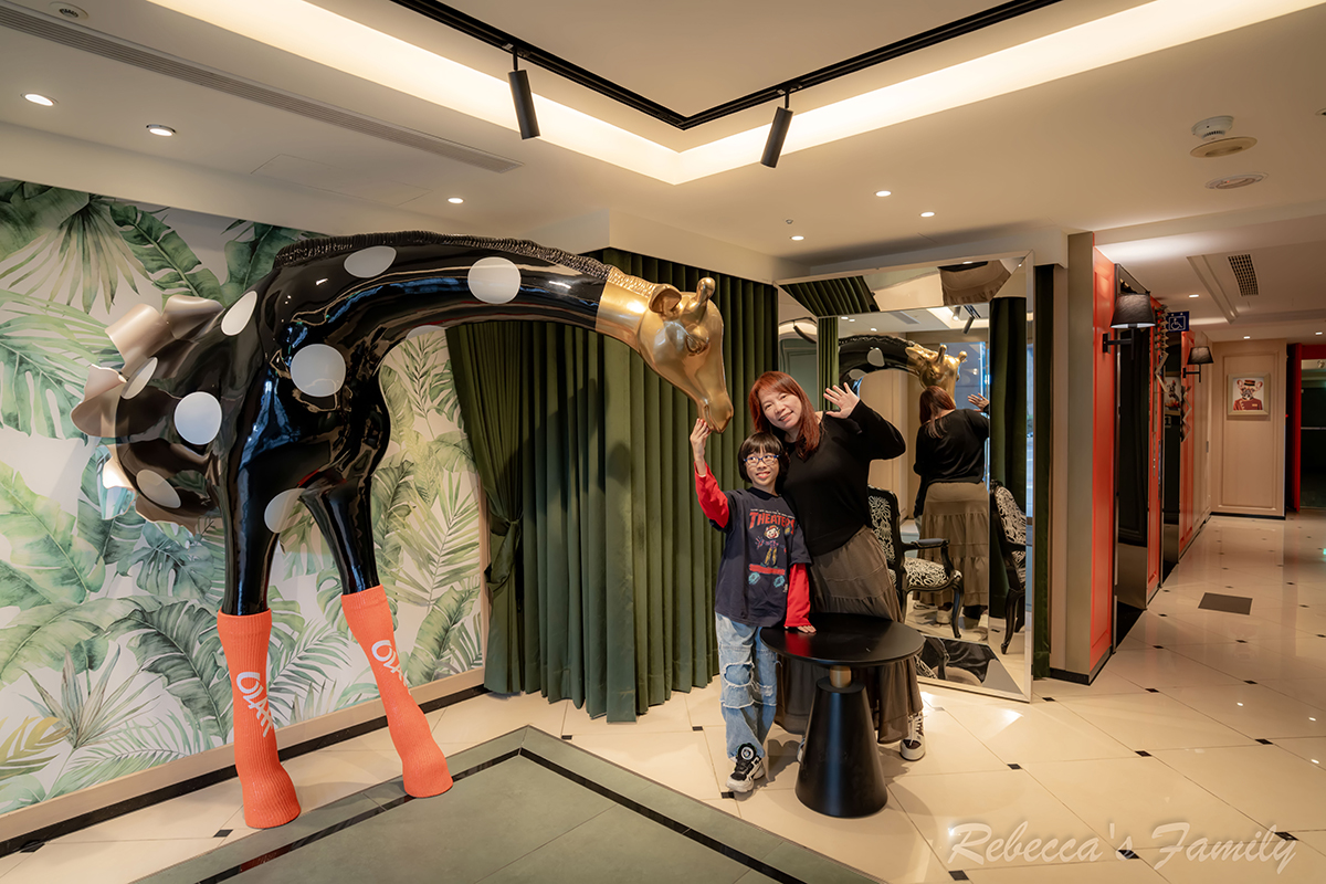 走進旅店的入口處,可以看到一個長頸鹿造型的拍照打卡點,一旁牆上掛著幾張很有趣的動物擬人掛圖,後方的書本造型糖果牆,絕對是小孩的最愛。