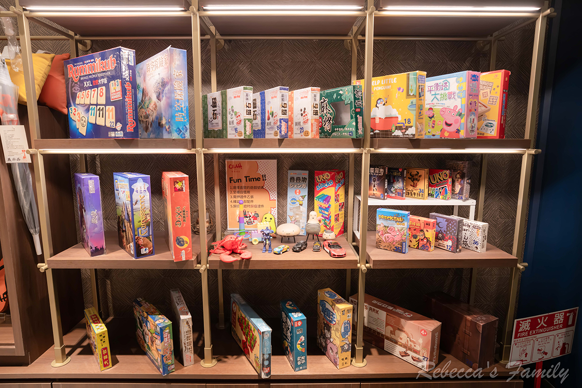 報到櫃台在B1,旁邊有一整排的桌遊,只要押證件就能帶回房間玩。