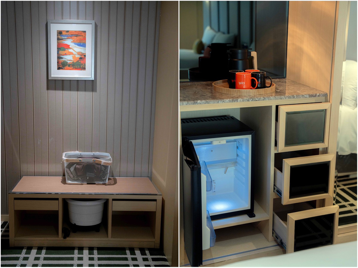 有小冰箱但無提供飲料,也沒有瓶裝水,僅提供冷水壺與馬克杯,可至走廊梯間的飲水機裝水。