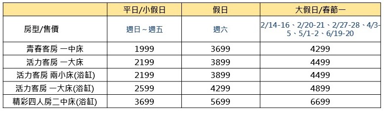 - 房型:陽光客房/活力雙人房/青春四人房/歡樂四人房/青春五人房