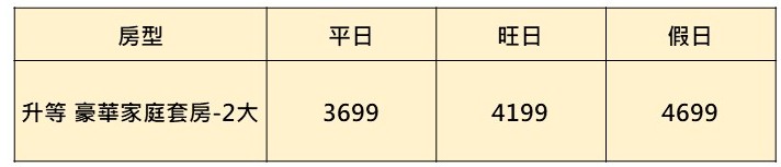 不分平假日都直接升等豪華家庭套房,原價是$8100,團購優惠價 二天一夜$4199起、三天二夜一晚只要$3699起,比對折還便宜。