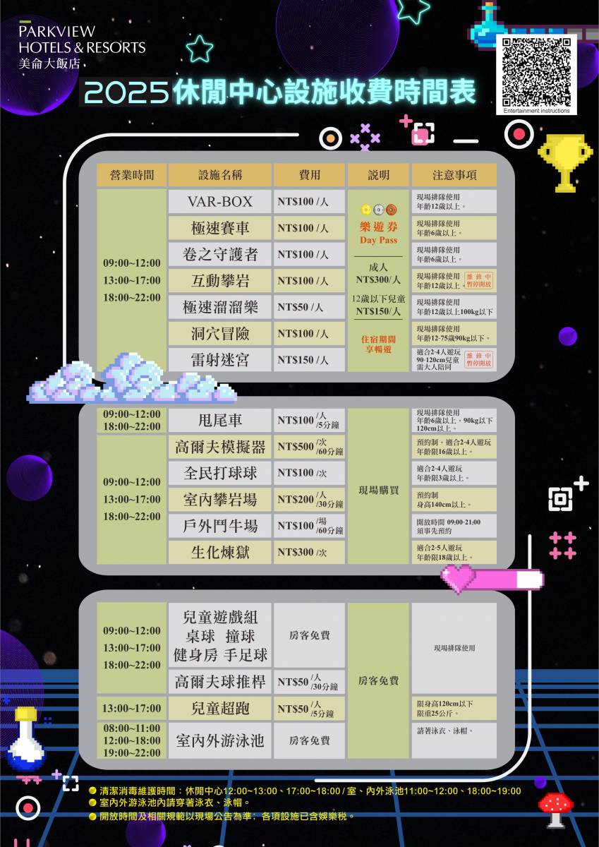 - 可提早、退房後使用設施 (需登記)。設施營運時間內使用,設施營運狀況依現場公告為主
