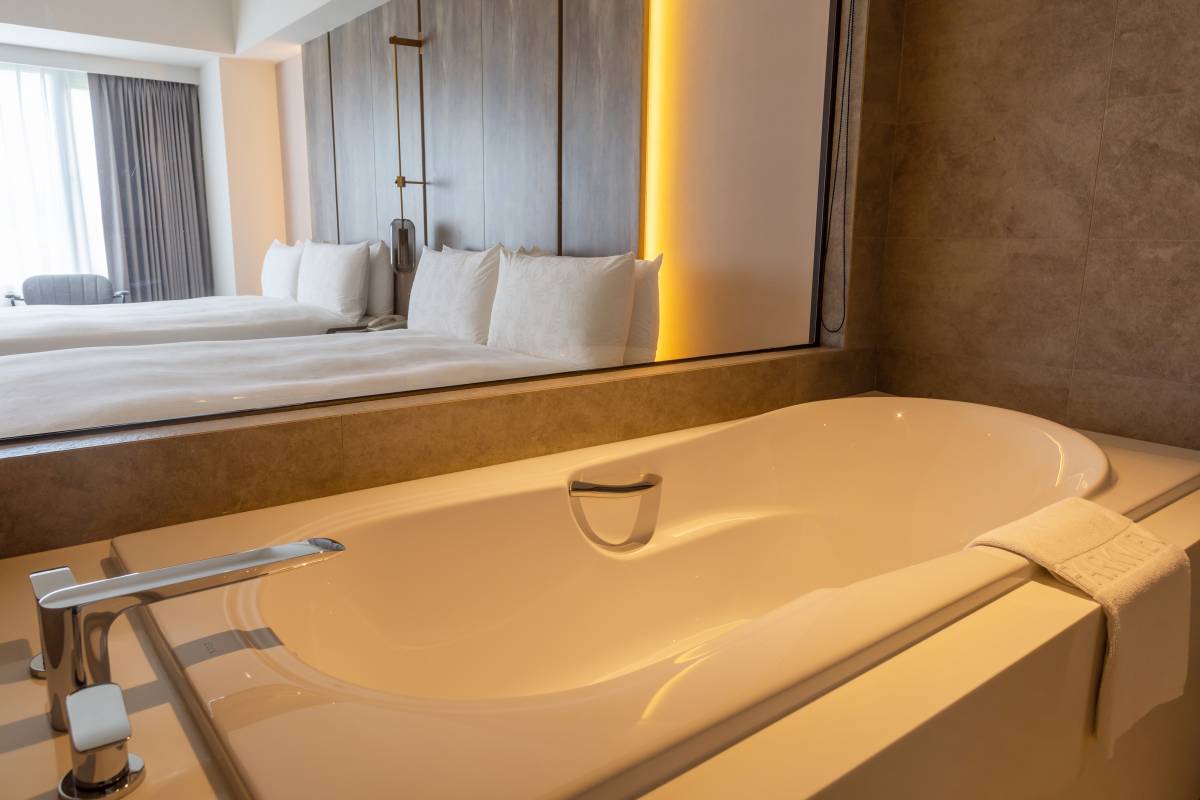 乾溼分離衛浴不稀奇,躺在浴缸裡視線能直穿窗外風景。