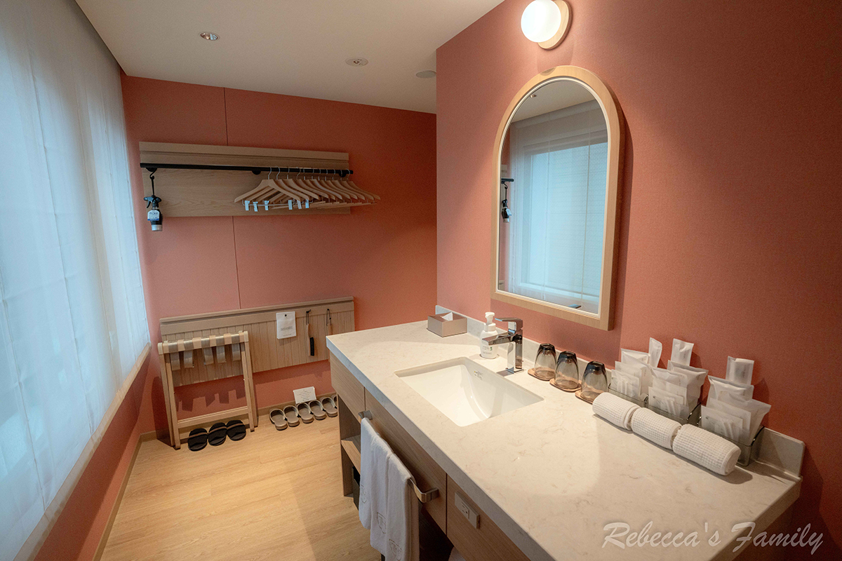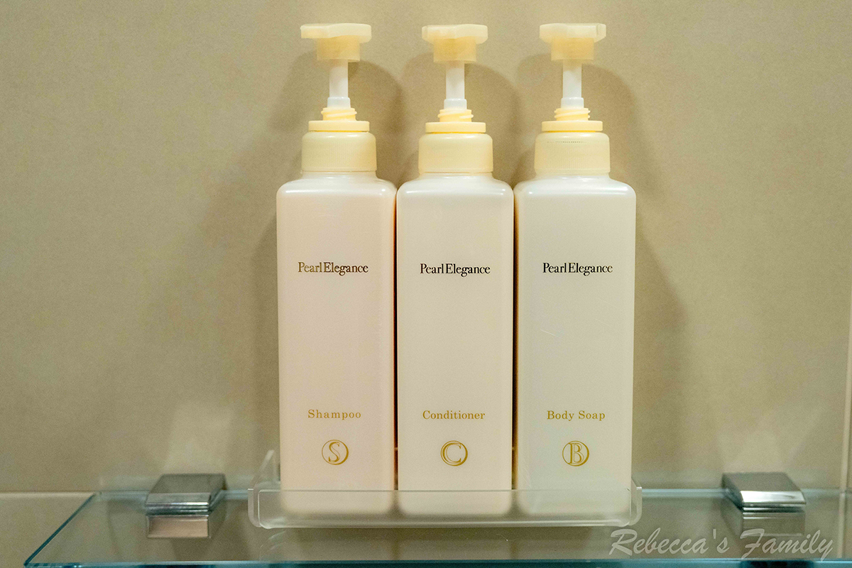 客房與衛浴之間以一扇木質拉門作為隔間,保有基本的隱私感。房內有提供基本的個人備品(梳子、刮鬍刀、牙刷、浴帽),洗沐用品則是 MIKIMOTO 壁掛式按壓瓶,包含洗髮乳、沐浴乳與身體乳,質感不錯。