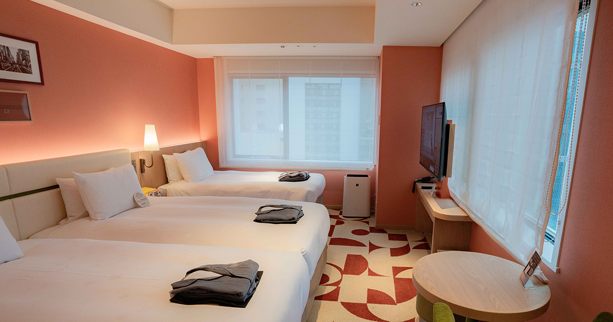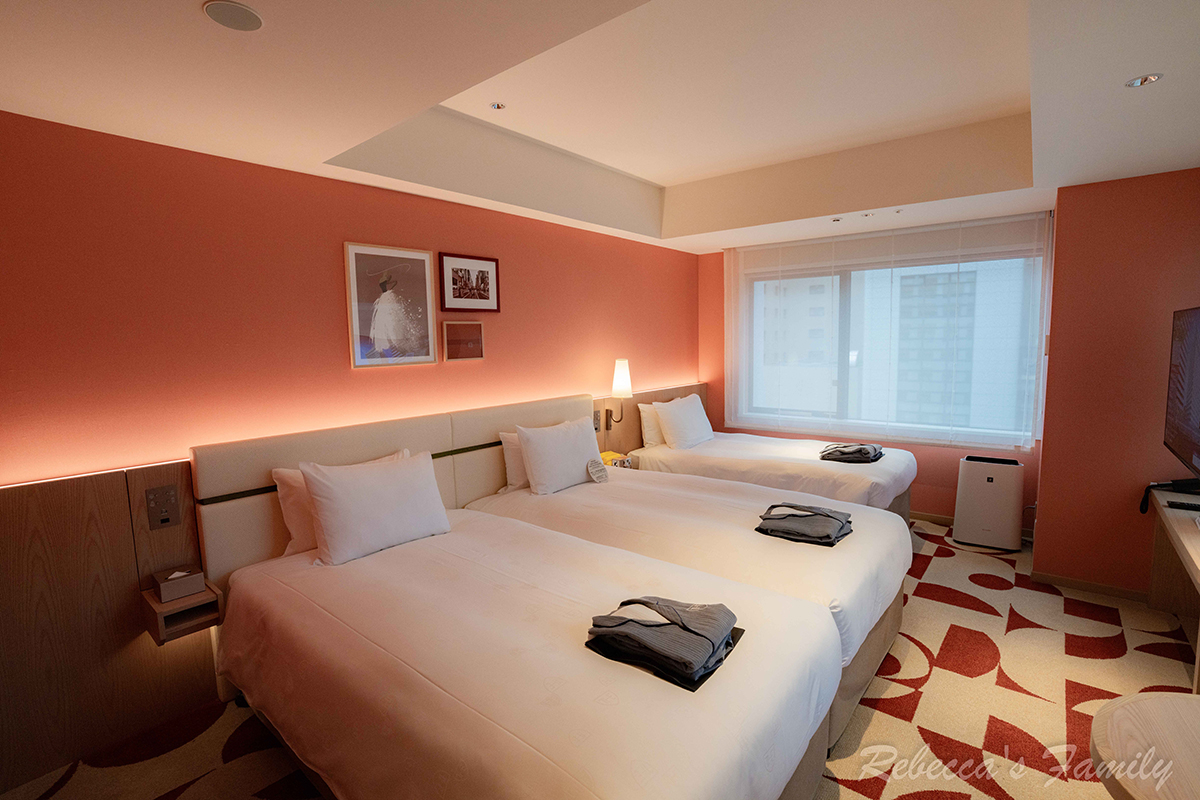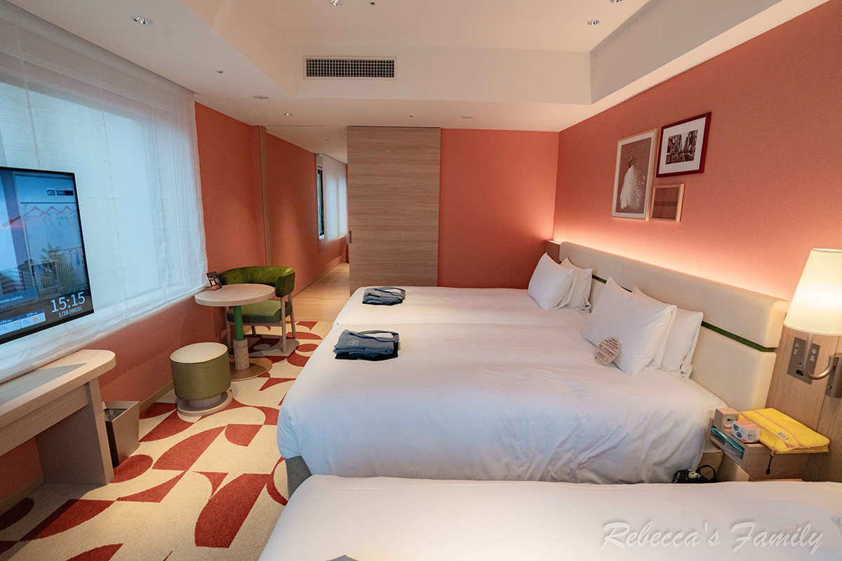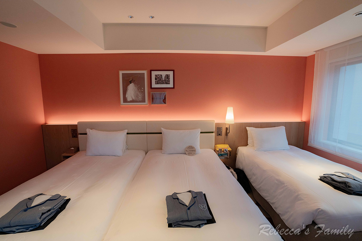 我們這次選的是空間相對舒適的 轉角雙床房(CORNER TWIN,定員 3 人),因為是邊間又有兩面採光,整體感覺更明亮、也不會那麼壓迫,空間約38平方公尺(約11.5坪)。