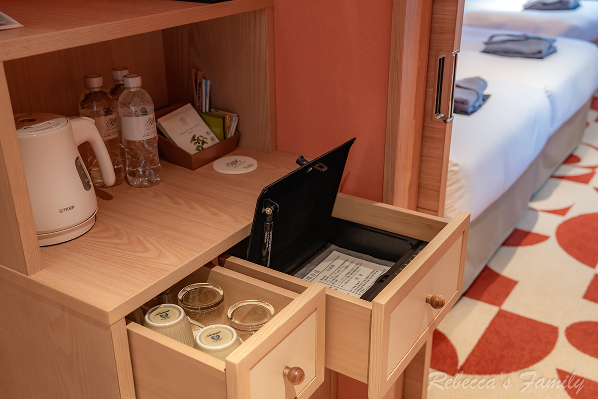 房內會依照入住人數提供瓶裝水,另外也有茶包、濾掛咖啡包與電熱壺,小冰箱裡則沒有附免費飲料。