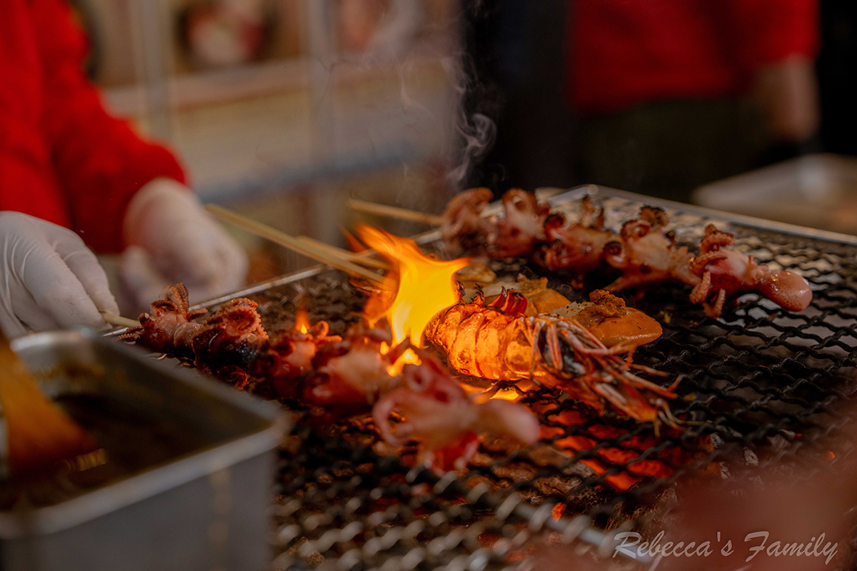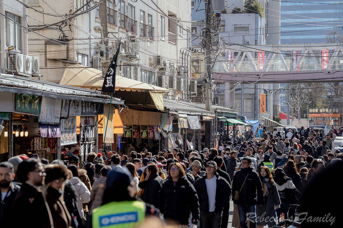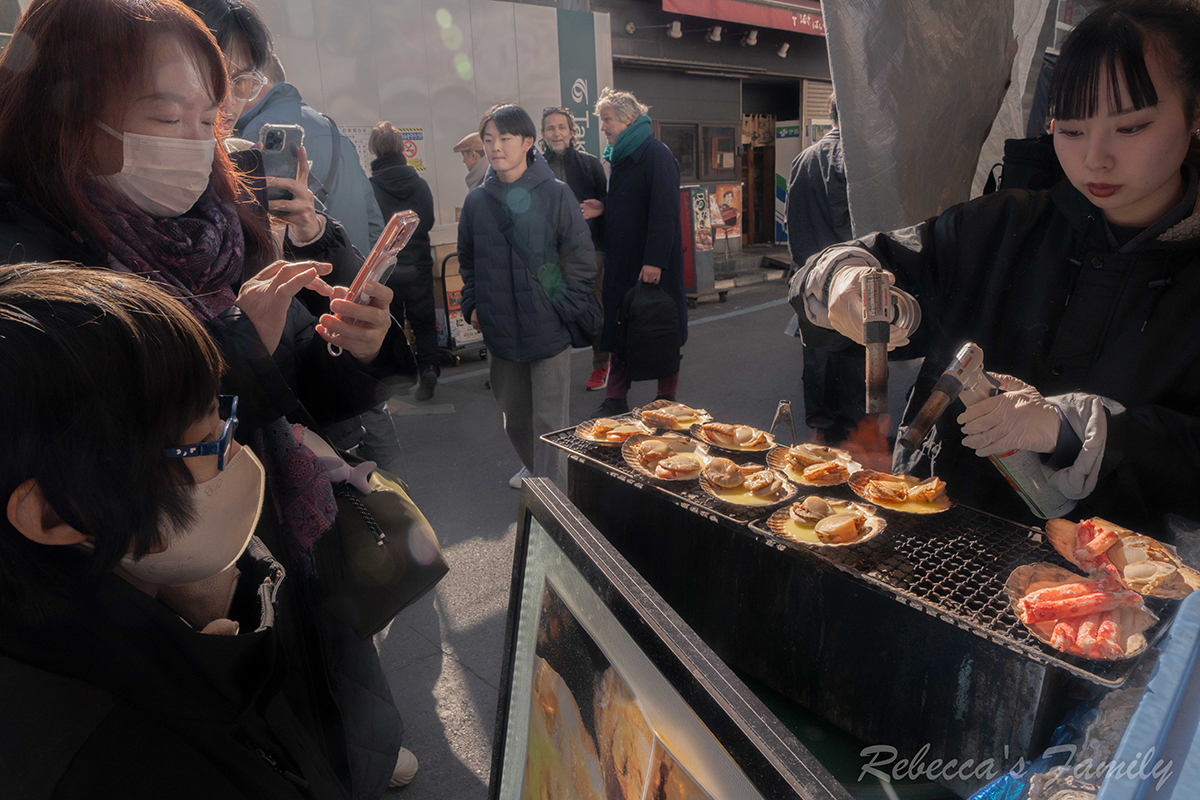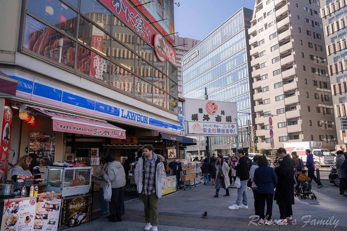 從飯店步行到築地市場大約10分鐘左右,這裡匯集許多販售生魚片、各類海鮮、燒烤的攤商,食物美味又便宜,所以每天總是擠滿了來自世界各地的觀光客來這邊嘗鮮。