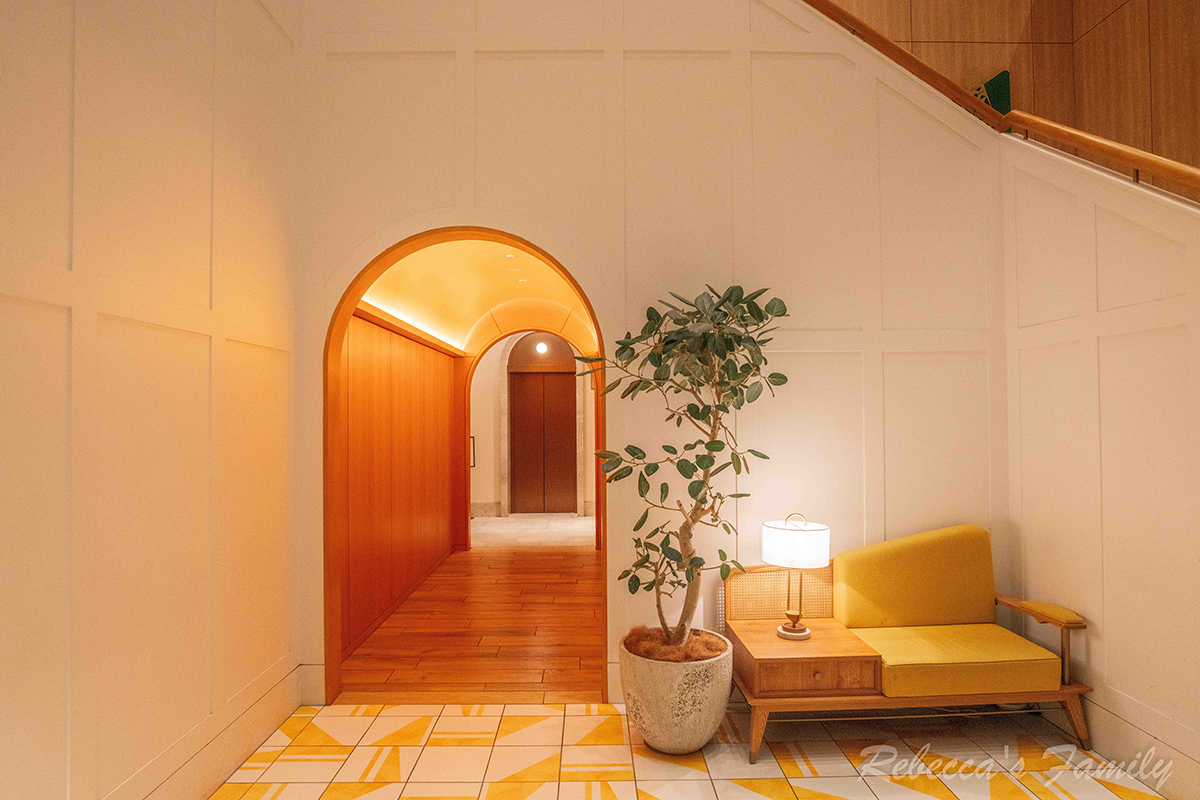 裝潢以大正時期的和洋簡約風為主,走廊與梯間以磚紅柿子色為主視覺,地毯圖樣則是大正時期常見的圓形元素,整體氛圍新舊交融,很有特色。
