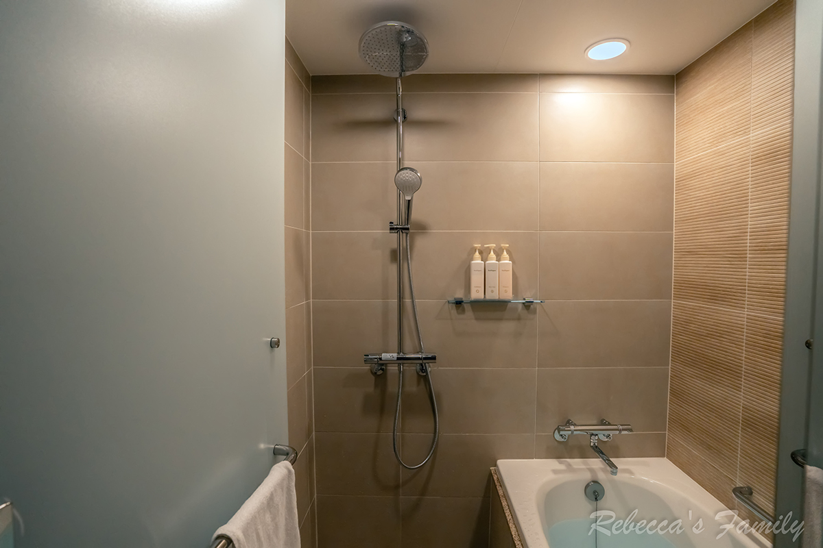 廁所為獨立一間設計,配有免治馬桶;浴室則是淋浴搭配浴缸,還有花灑可以使用。