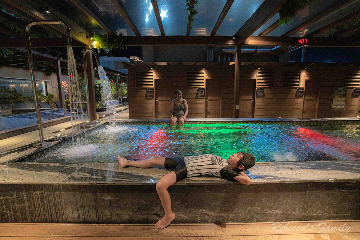 飯店頂樓有露天溫泉(17:00-21:30)、私人湯屋、烤箱,還有戶外泡腳池,室內有KTV、健身房。