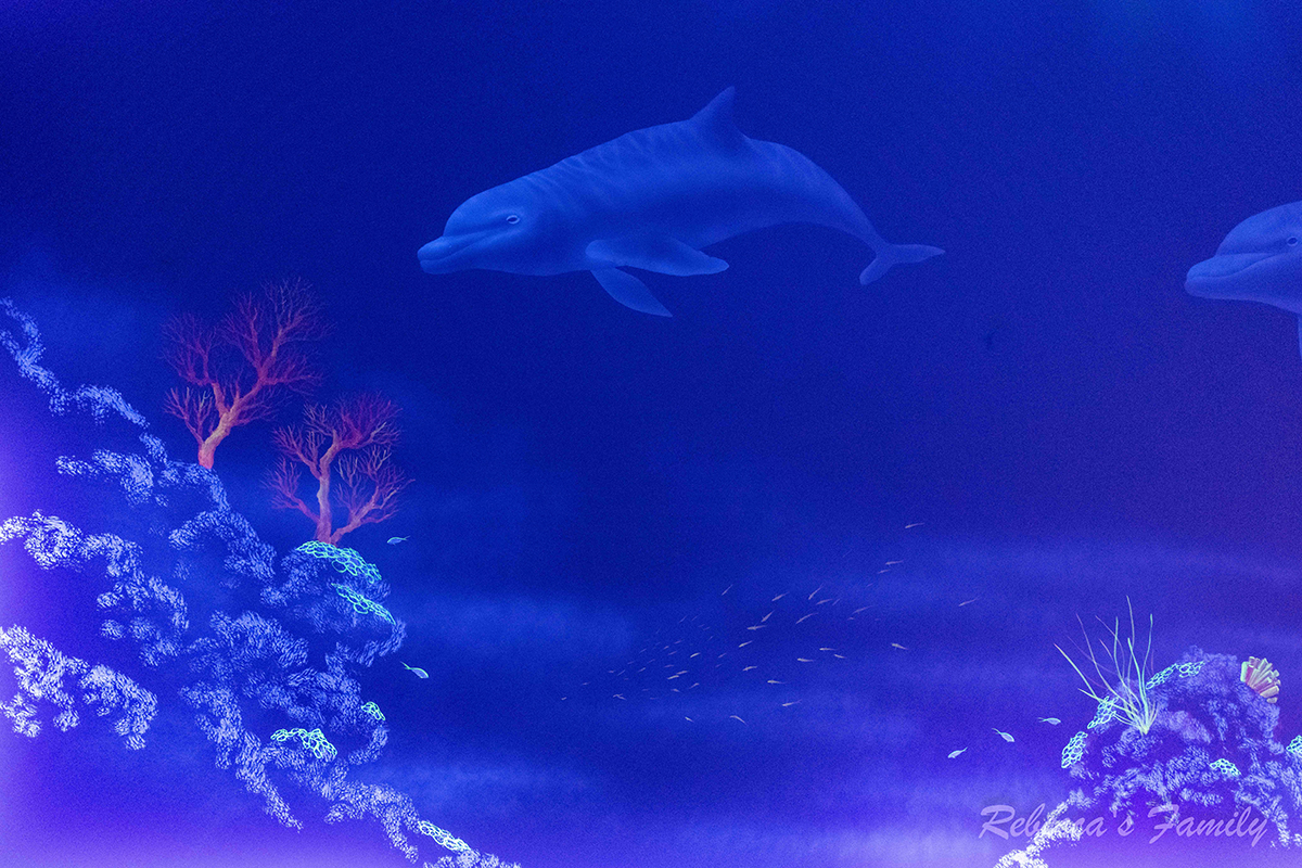 一整面的透明紅酒櫃很亮眼,天花板還有藍色小魚隨著海流群游的裝飾點綴。