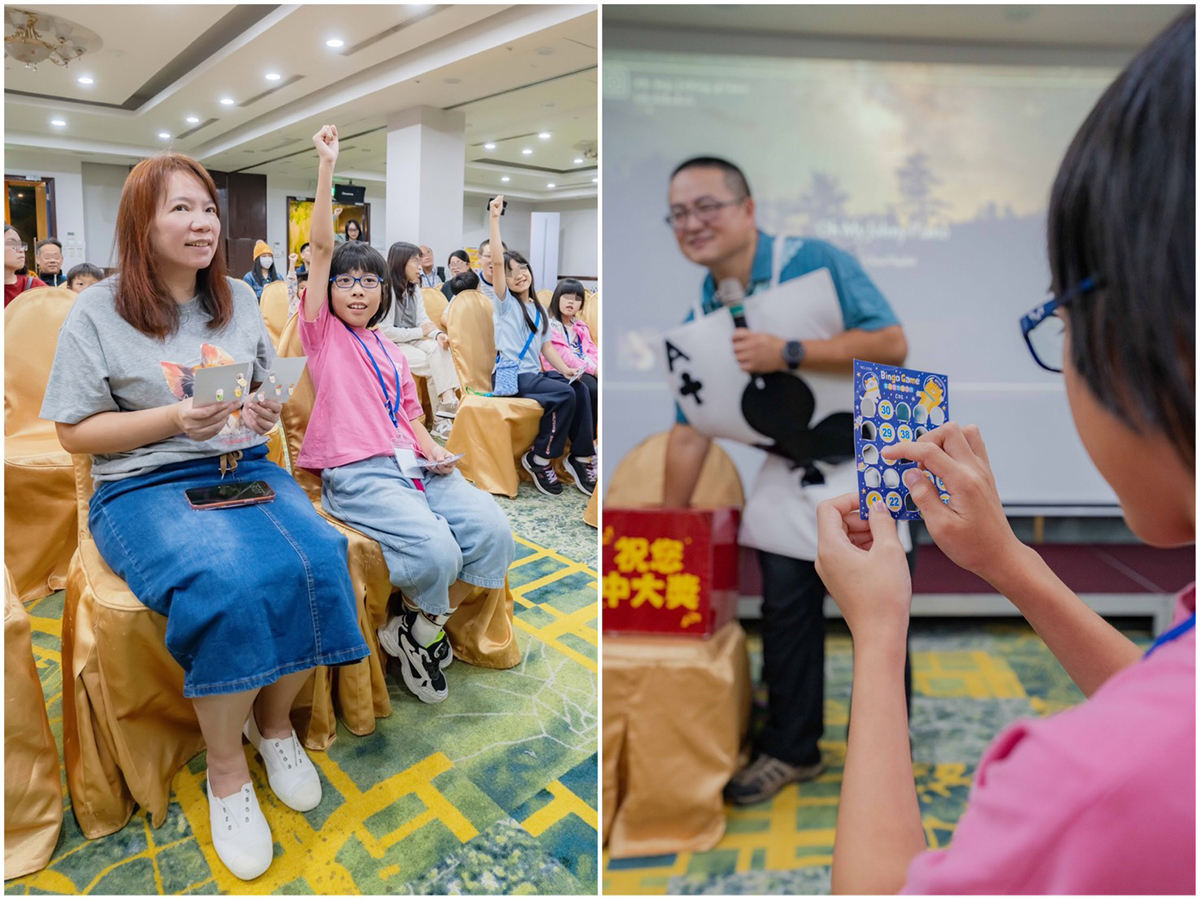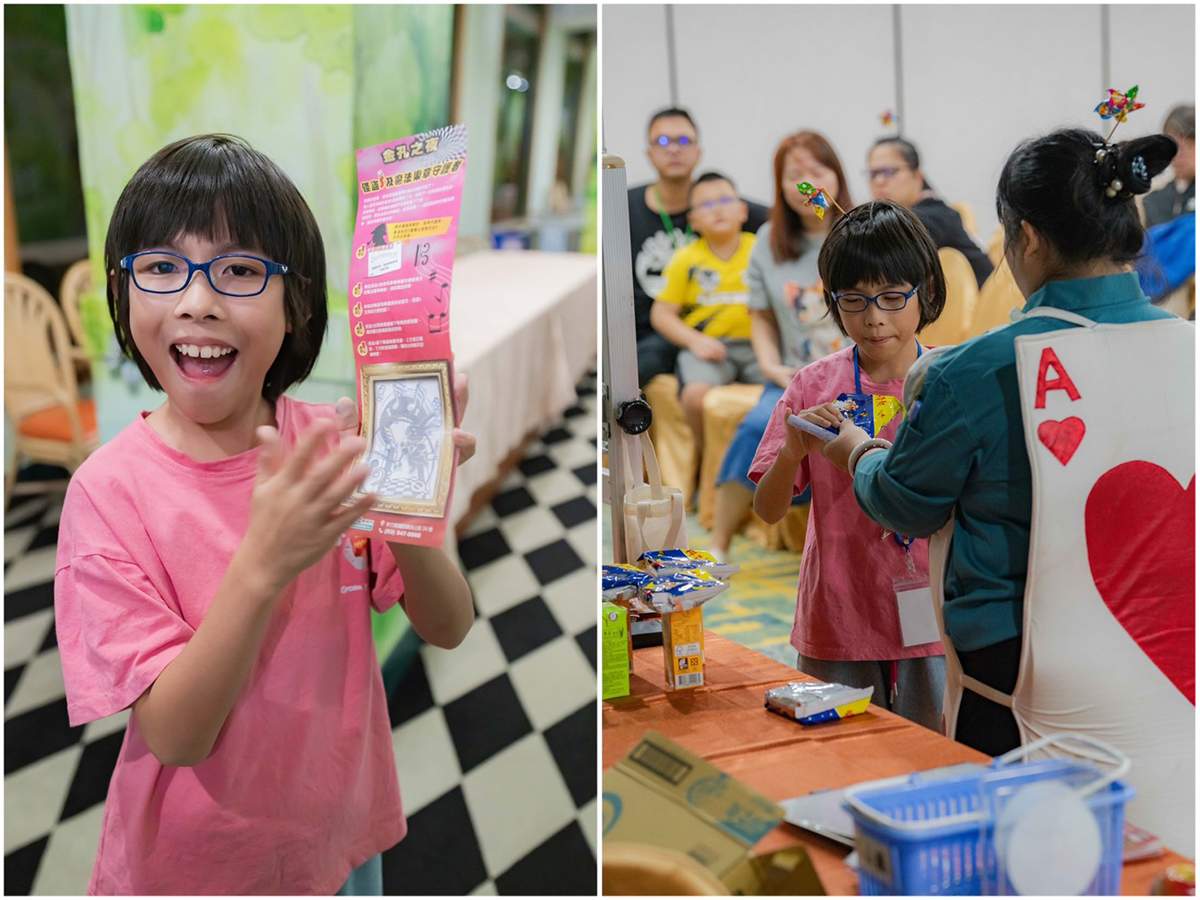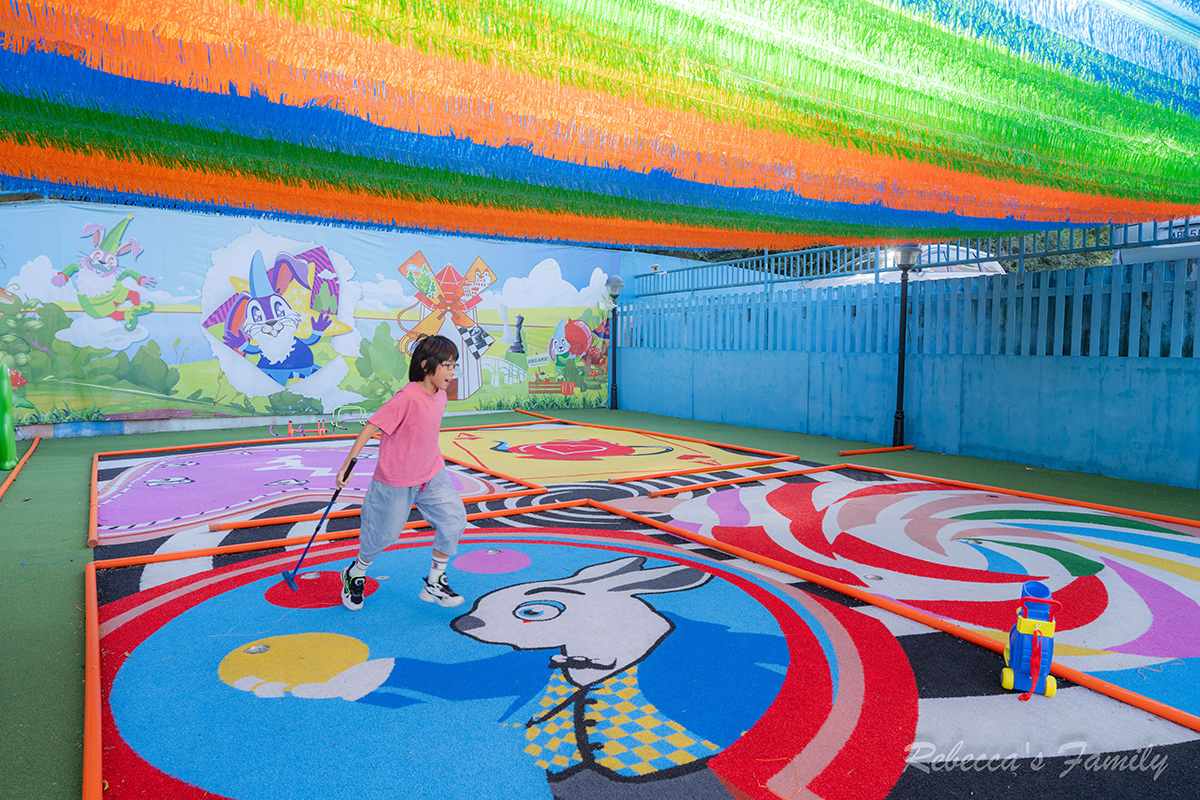 設計出時鐘、撲克牌、鑰匙孔、棒棒糖四大主題區塊,2025年還新增了遮陽簾就不用頂著烈日揮桿了。推桿遊戲考驗恩寶推桿的力道與準確度,不過小孩就是愛賴皮,恩寶直接把球放在洞前推桿進洞。