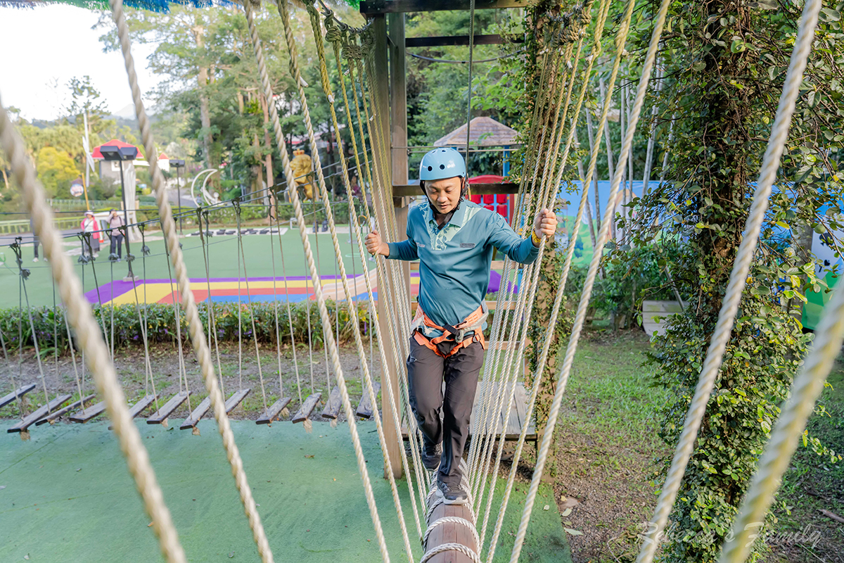 鞦韆路、上昇橋、搖晃斷橋、繩網、匍匐前進,使用設施需穿戴園方準備的安全裝備。