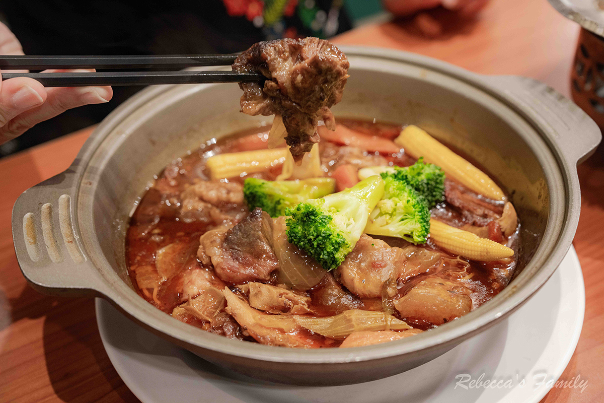 B:五味澎湖冰卷、客家冬菜蒸魚、季節時蔬、勃根地燉牛雙寶鍋,再送起司香蒜脆餅。