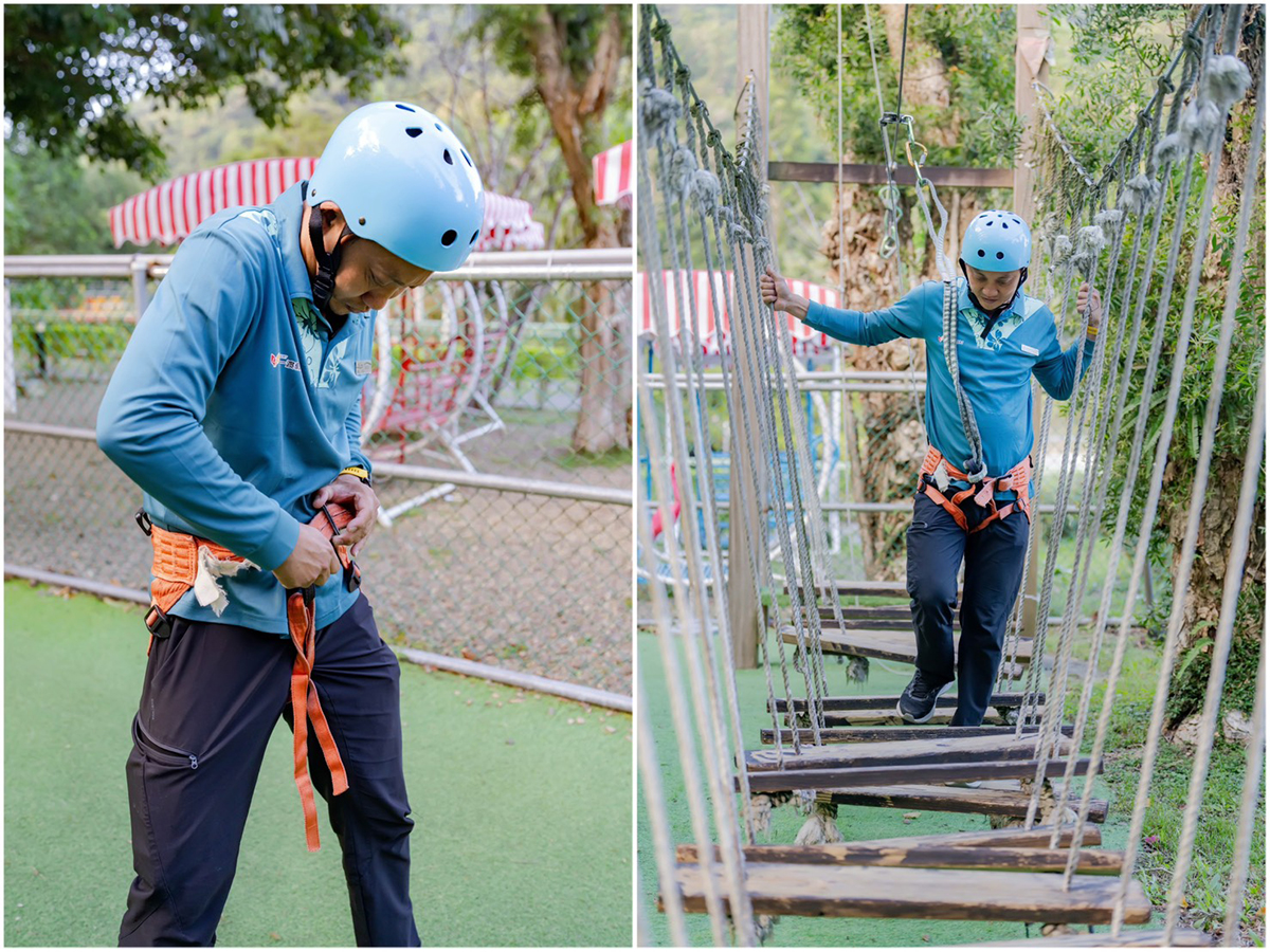 - 探索教育體驗區(使用規則依現場公告) 鞦韆路、上昇橋、搖晃斷橋、繩網、匍匐前進, 總價值700元 ,獨享優惠 (入住期間每房可以玩1次, 依現場天氣狀況調整設施是否開放)